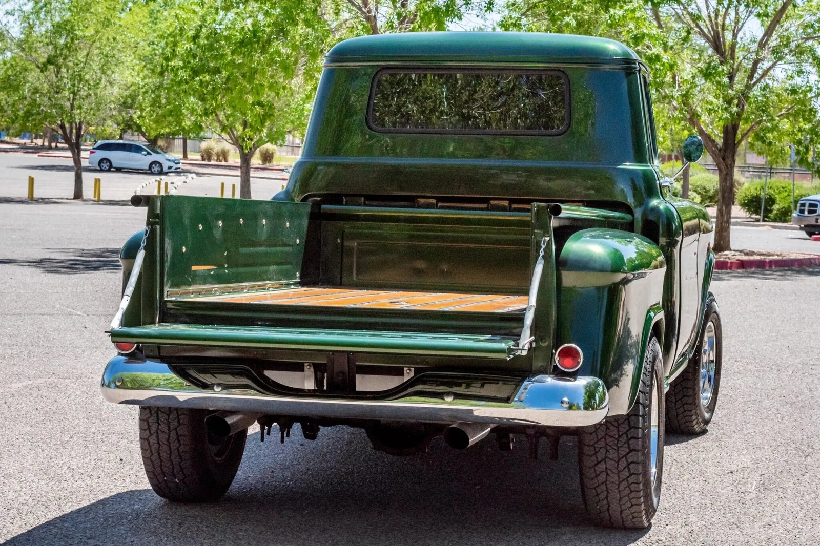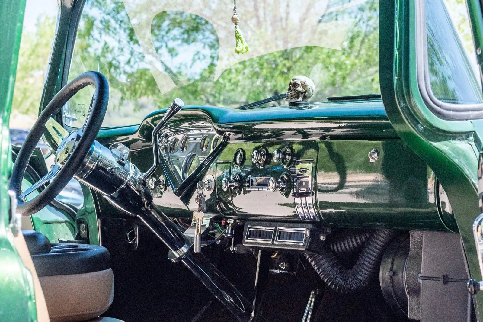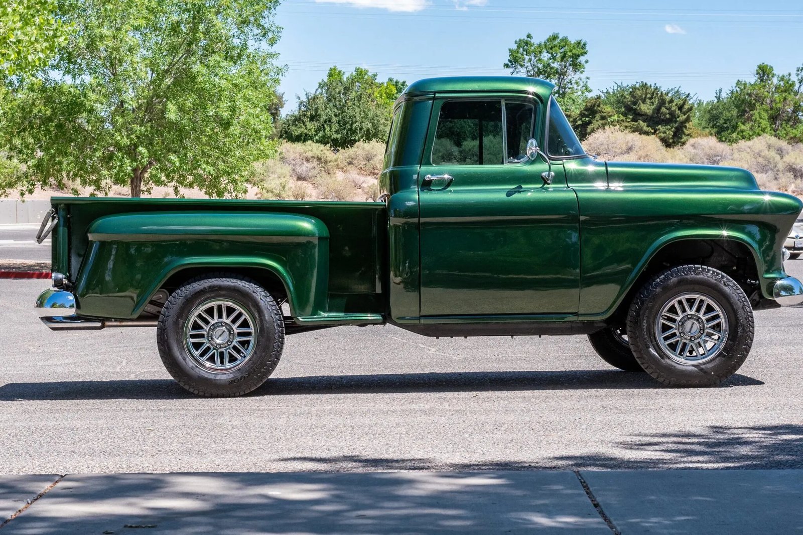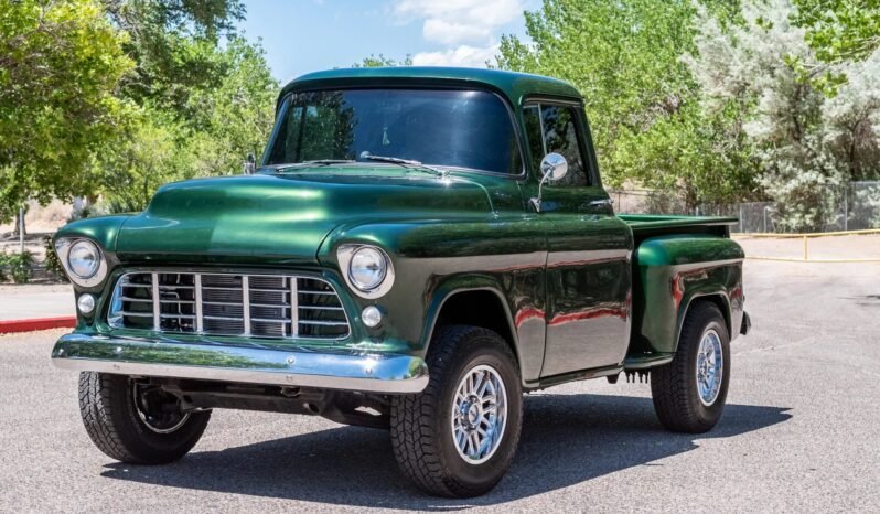 The truck is finished in green over tan upholstery and equipped with air conditioning, a Holley Sniper electronic fuel injection system, power steering, and front disc brakes as well as 16″ Raceline wheels, dual side mirrors, and a wood-plank bed.