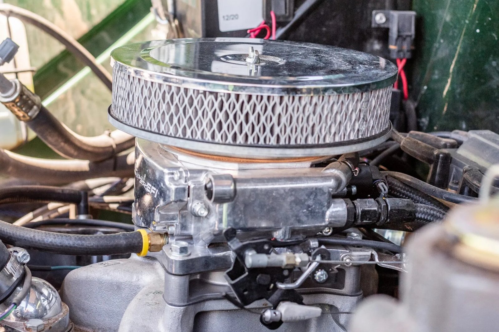 The replacement 350ci Chevrolet small-block V8 is equipped with a Holley Sniper electronic fuel injection system and a chrome air filter housing.