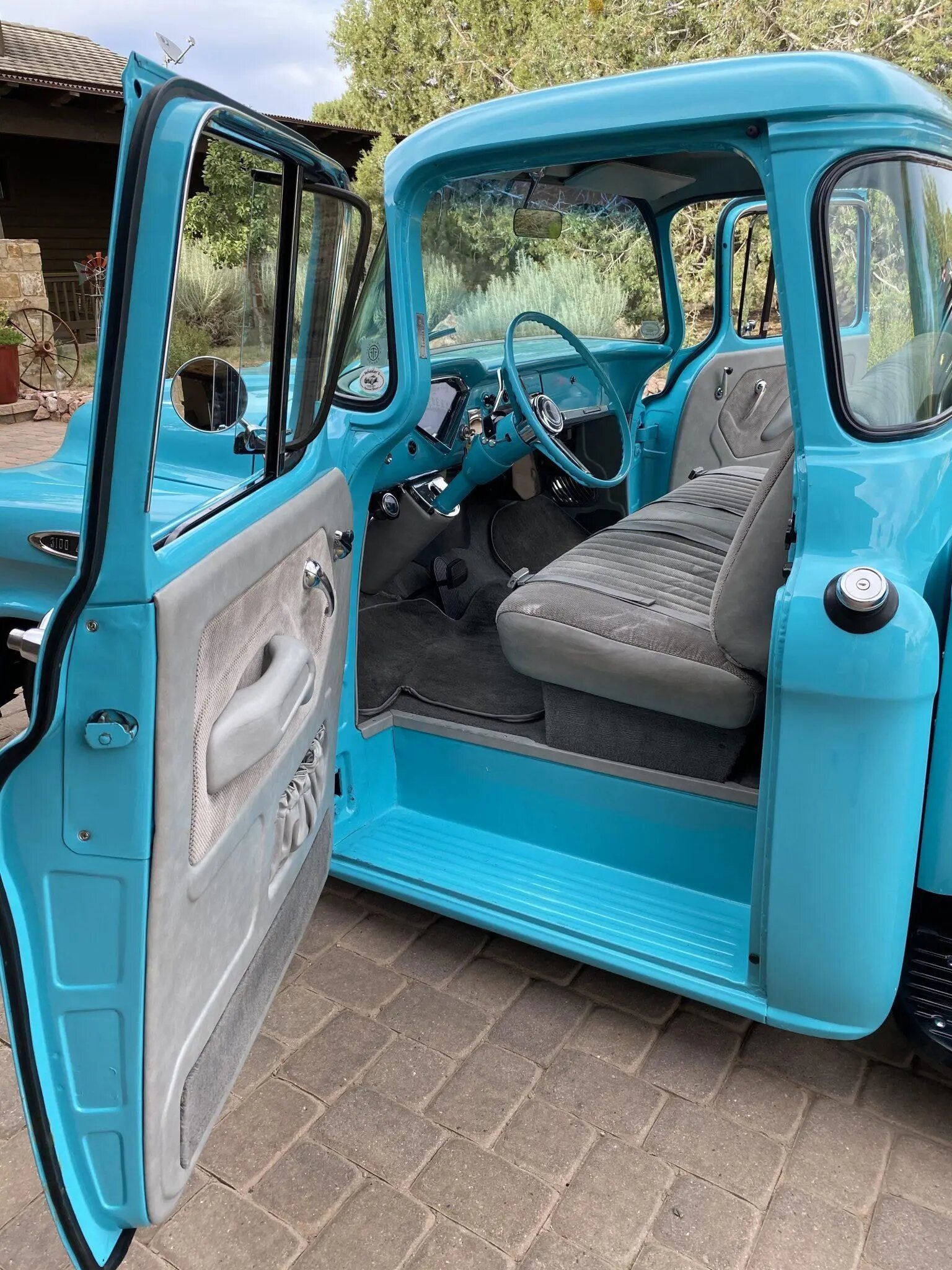 The body-colored cab features a gray color scheme on the bench seat, door panels, and headliner completed by Leon’s Upholstery.