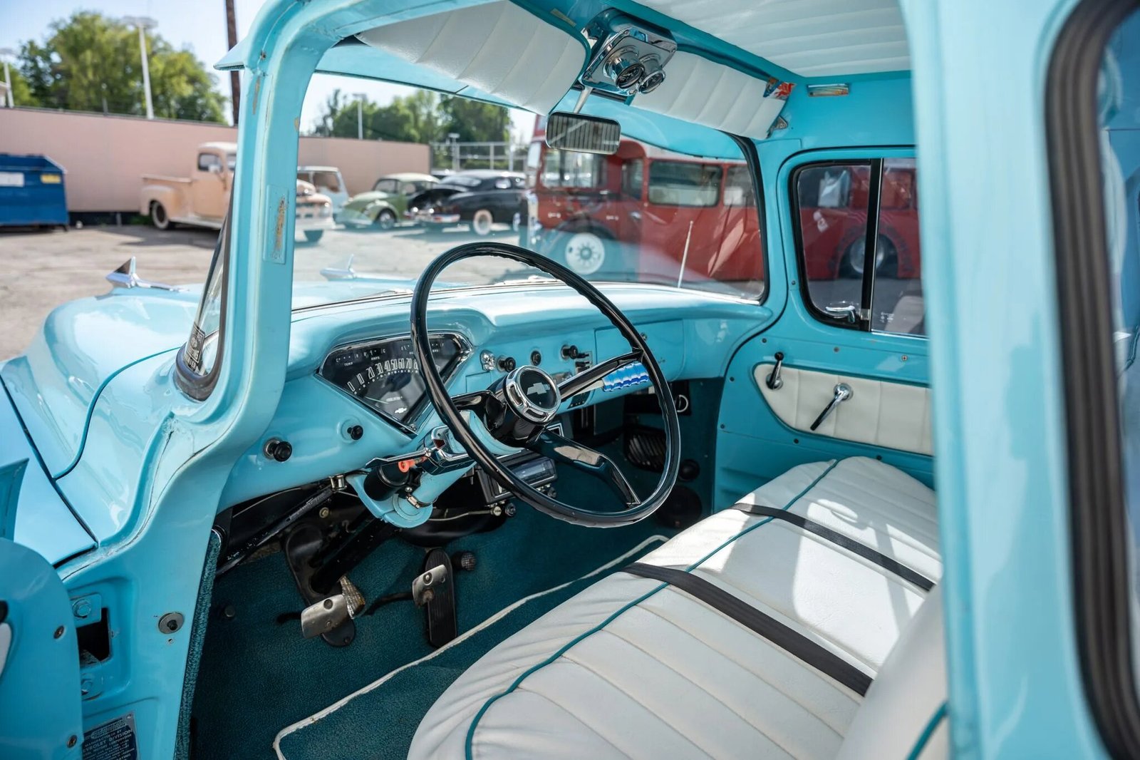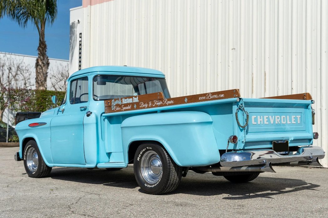 This 1957 Chevrolet 3200 pickup was subsequently modified and used as a shop truck. The truck is finished in blue over white vinyl upholstery and powered by a 235ci inline-six mated to an M40 three-speed manual transmission and a rear axle with 3.33:1 gears. Modifications include a lowered suspension, Ridetech shock absorbers, front disc brakes, 15″ smoothie-style wheels, a bed-mounted fuel tank, an oak bed floor, MSD electronic ignition, a Clifford intake and exhaust manifold, a Be Cool aluminum radiator, air conditioning, a Kenwood CD stereo, and a 12-volt electrical conversion with a modern fuse panel.