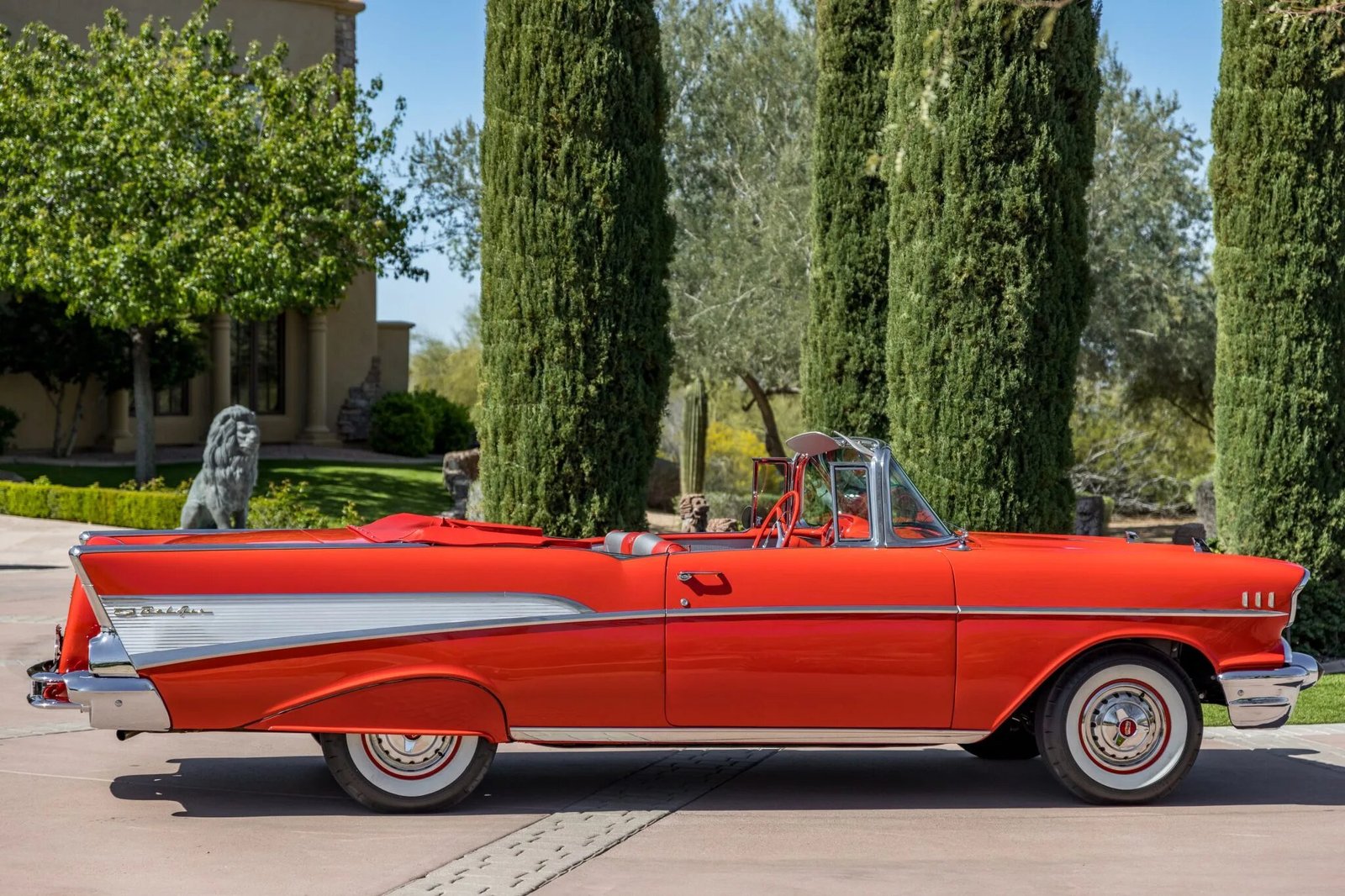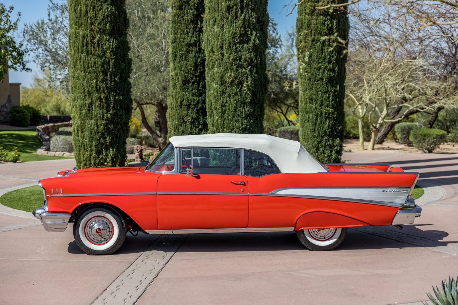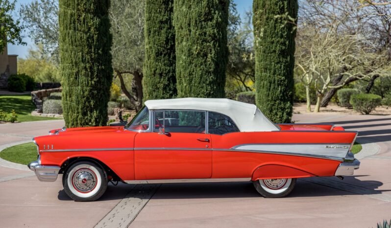 This 1957 Chevrolet Bel Air convertible is finished in Matador Red over red and silver vinyl upholstery, and it is powered by a 283ci V8 paired with a four-speed manual transmission. Equipment includes a power-operated white soft top, 14″ wheels, dual four-barrel carburetors, rear fender skirts, a Continental kit, power steering, and a push-button AM radio.