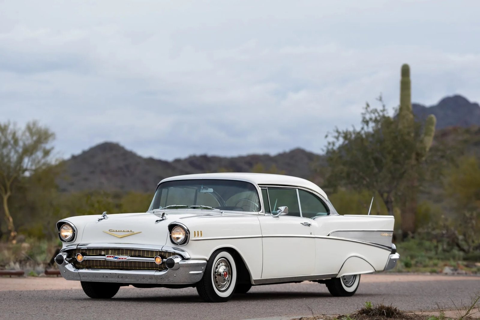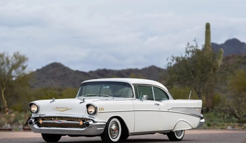 This 1957 Chevrolet Bel Air has subsequent work in 2011 by Manny’s Paint & Body Shop consisted of stripping and refinishing the body and chassis and installing CPP suspension components, four-wheel disc brakes, and an updated audio system as well as a replacement 350ci V8 mated to a 700R4 four-speed automatic transmission. The car is finished in white over black and gray upholstery, and features include rear fender skirts, an Edelbrock Pro-Flo 3 EFI system, MSD electronic ignition, air conditioning, power steering, Coker Classic whitewall tires, Dakota Digital instrumentation, power windows, and a retro-style digital stereo.
