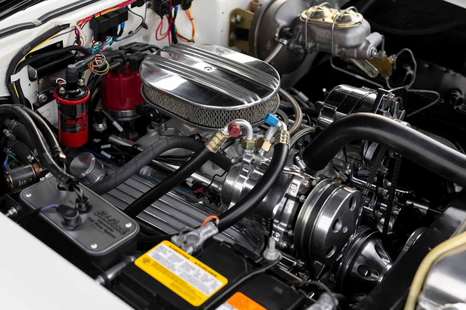 The replacement 350ci V8 was installed during the refurbishment and features an Edelbrock Pro-Flo 3 EFI system and intake manifold, MSD electronic ignition and distributor, billet drive pulleys, polished exhaust manifolds, and a finned air cleaner lid and valve covers.