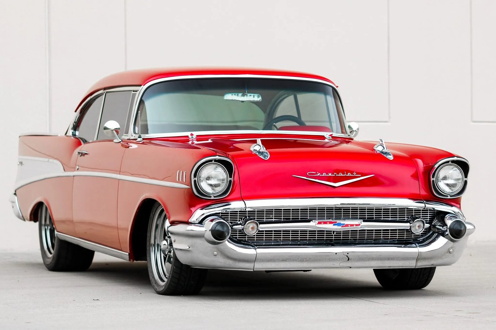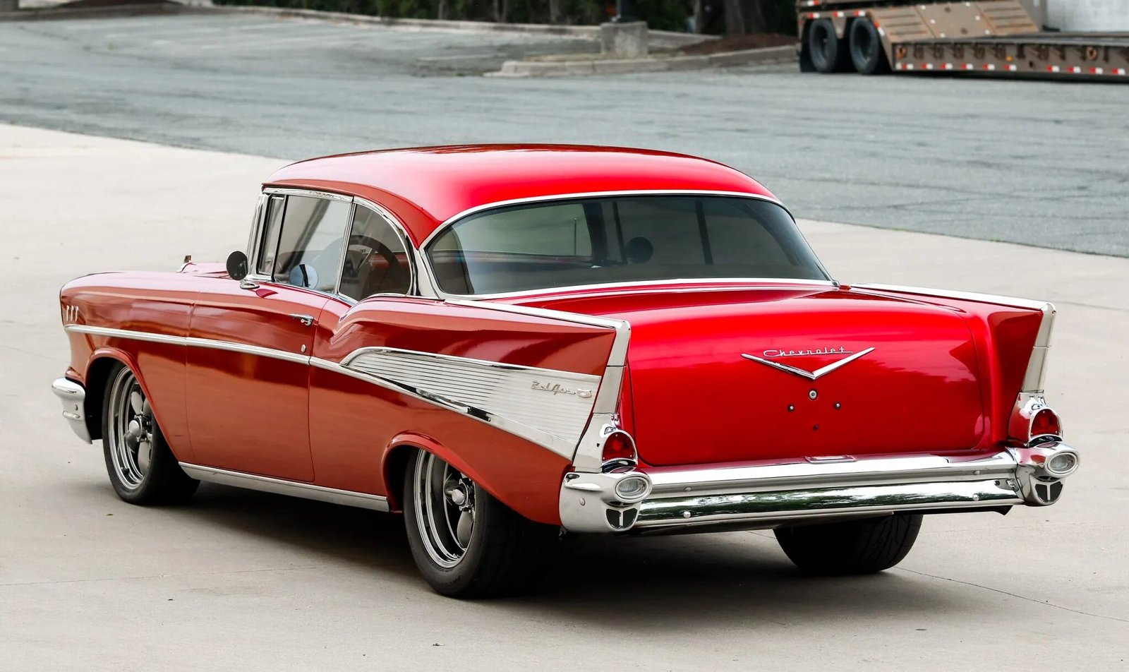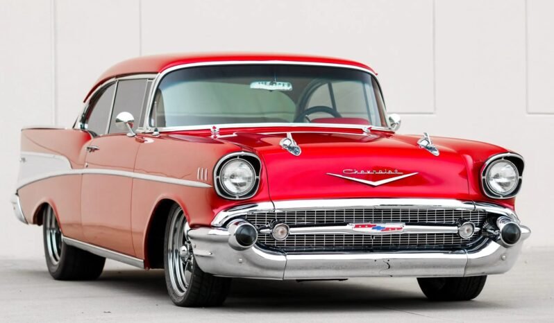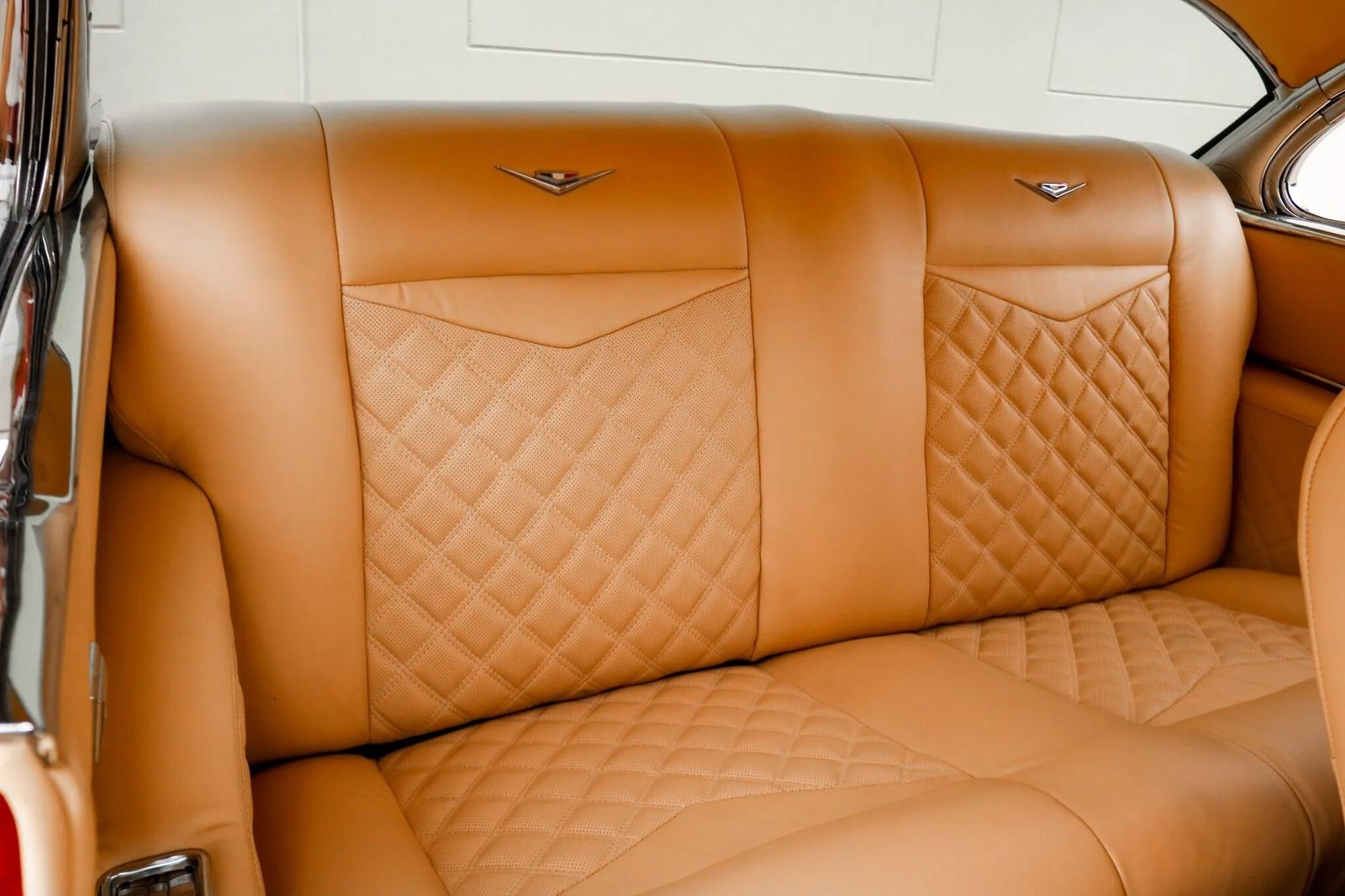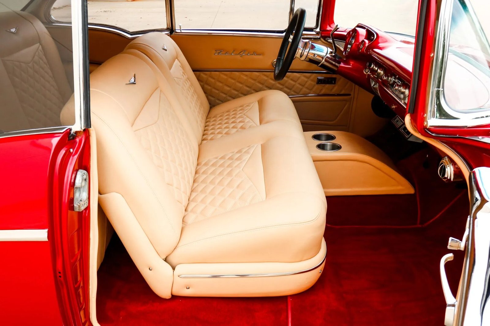 This 1957 Chevrolet Bel Air 2-door hardtop was modified by Bones Fab. Work involved stripping and refinishing the body, re-trimming the interior, and installing an Art Morrison chassis as well as a Magnuson-supercharged 408ci Vortec V8 linked with a 4L80E four-speed automatic transmission and a 9″ rear axle. The car is finished in red over a tan leather interior with air conditioning, Dakota Digital instrumentation, and a RetroSound stereo connected to JBL Audio speakers. Additional features include power steering, a Hydroboost power brake system, Wilwood four-wheel disc brakes, 18″ American Racing wheels, JRi adjustable coilovers, a Painless wiring harness, a Holley Dominator EFI system, a Griffin aluminum radiator, and a custom dual exhaust system with tubular headers and Borla mufflers.