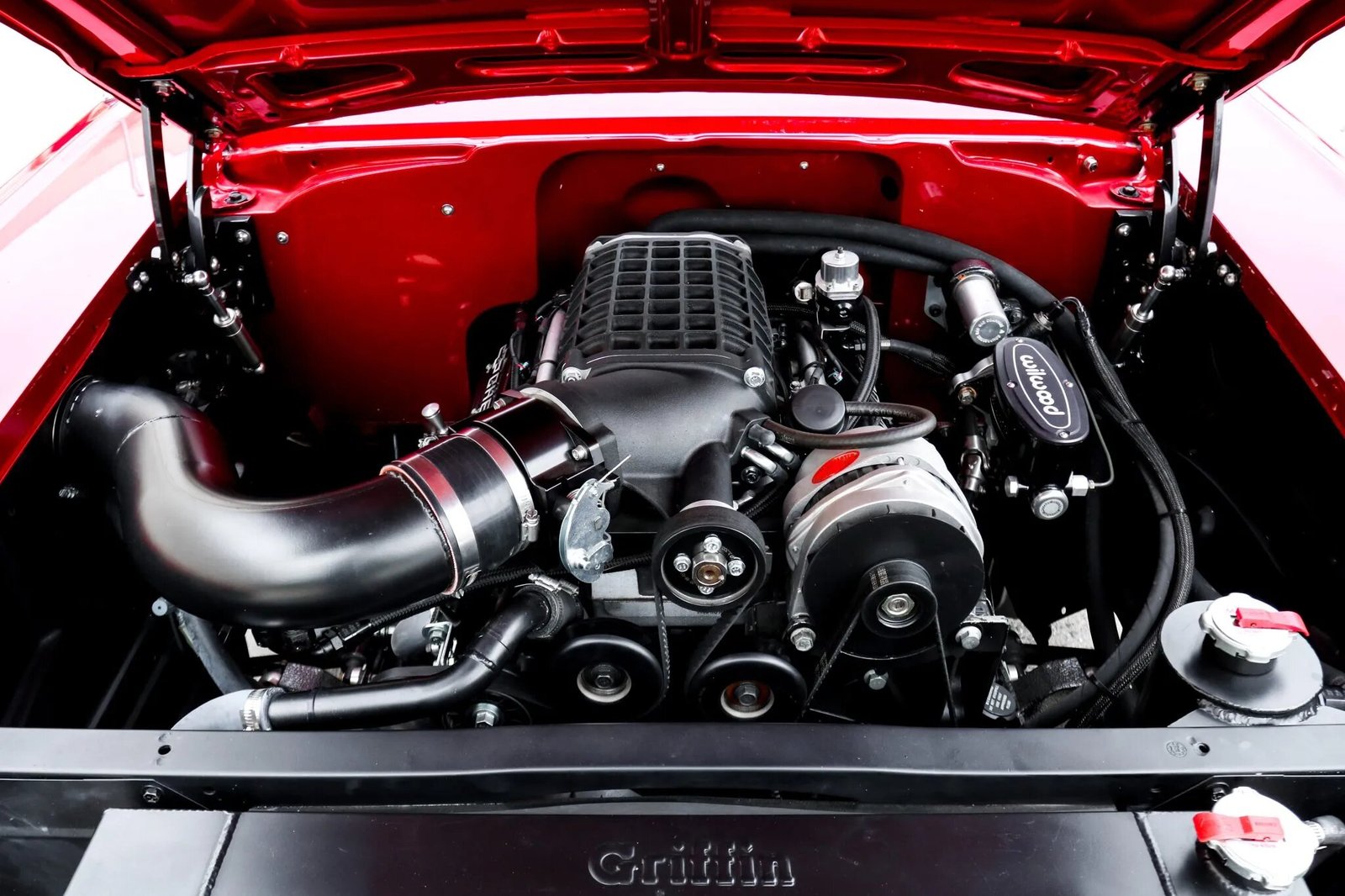 The engine is displace 408ci and features a Magnuson supercharger, a Holley Dominator EFI system, a custom air intake system, a Griffin aluminum radiator, Chevrolet-branded valve covers, and tubular exhaust headers.