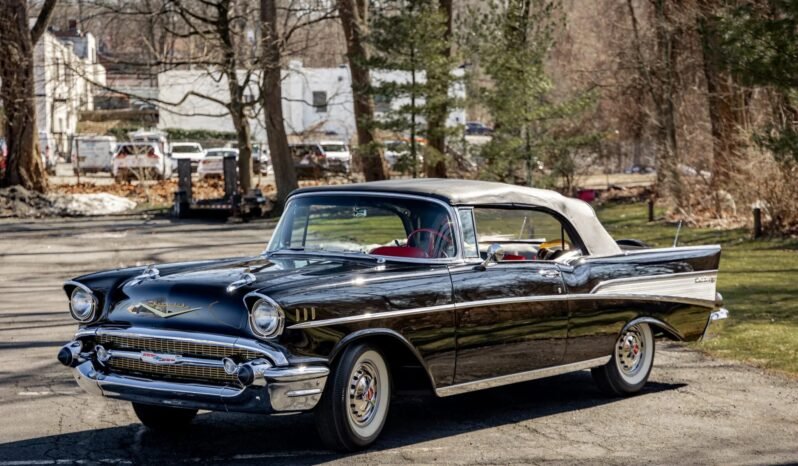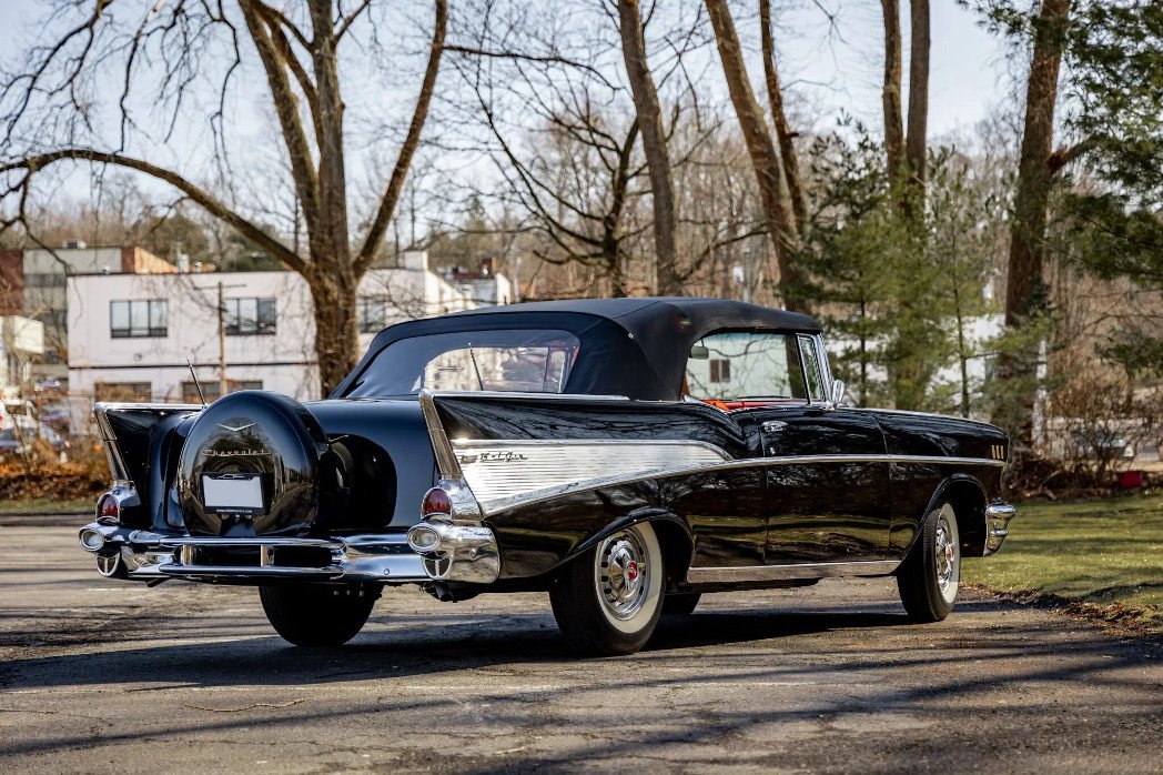 This 1957 Chevrolet Bel Air convertible was refurbished before the owner purchased it in 2015, and it is powered by a 283ci V8 topped with dual four-barrel carburetors and paired with a two-speed automatic transmission. The car is finished in black over red and silver vinyl, and equipment includes a power-operated black convertible top, a continental spare tire kit, a Wonder Bar AM radio, a power-adjustable front seat, power windows, power brakes, and a dual exhaust system.