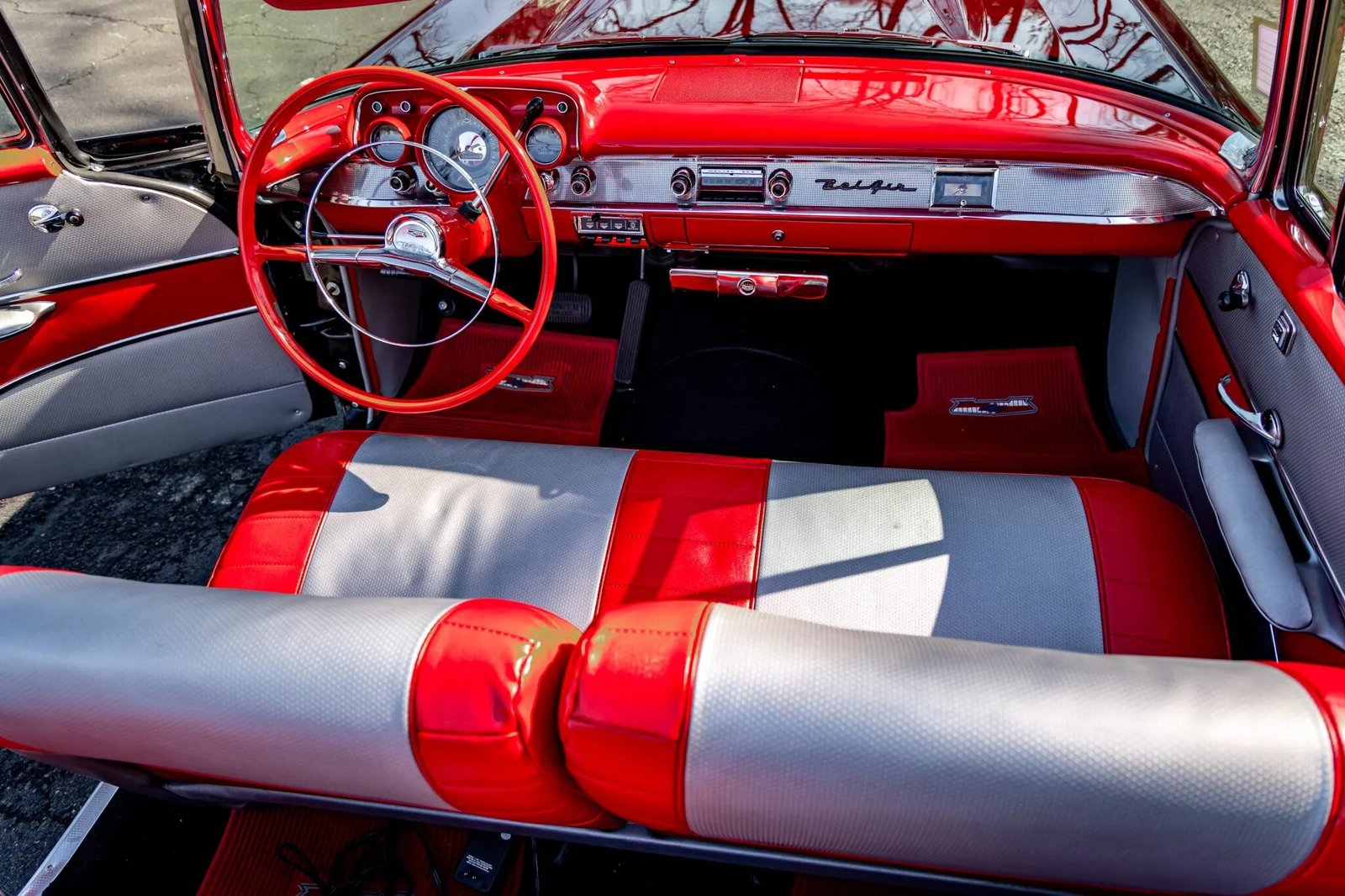 The cabin features a power-adjustable front seat upholstered in red and silver vinyl along with a Wonder Bar AM radio, a locking glovebox, an analog clock, power windows, floor mats, and vent windows.
