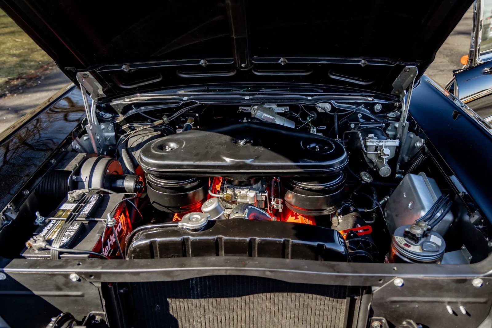 The 283ci V8 is topped with dual four-barrel carburetors and Chevrolet-script valve covers. The fluids were serviced in preparation for sale.