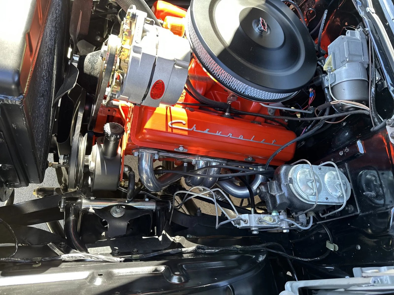 The 350ci V8 have been overhauled in preparation for the sale and is equipped with an Edelbrock carburetor, an aluminum radiator, and ceramic-coated exhaust headers. Service included installing a replacement alternator, wiring harness, aluminum radiator, battery, fuel tank, fuel-sending unit, and horns. Power is sent to the rear wheels via a three-speed automatic transmission.