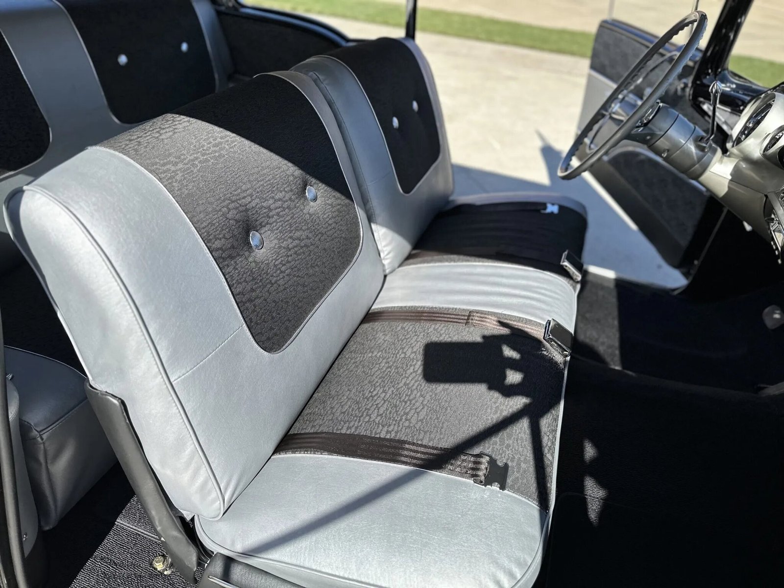 The seats and the door panels were reupholstered in gray vinyl and black patterned cloth.