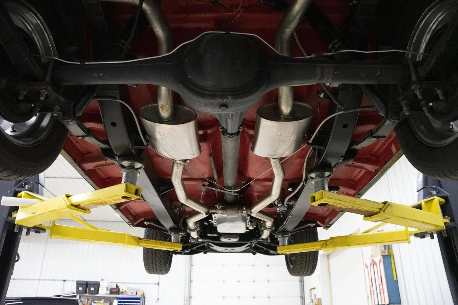 Aftermarket headers are linked to a dual exhaust system with Borla mufflers.