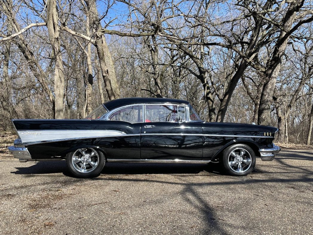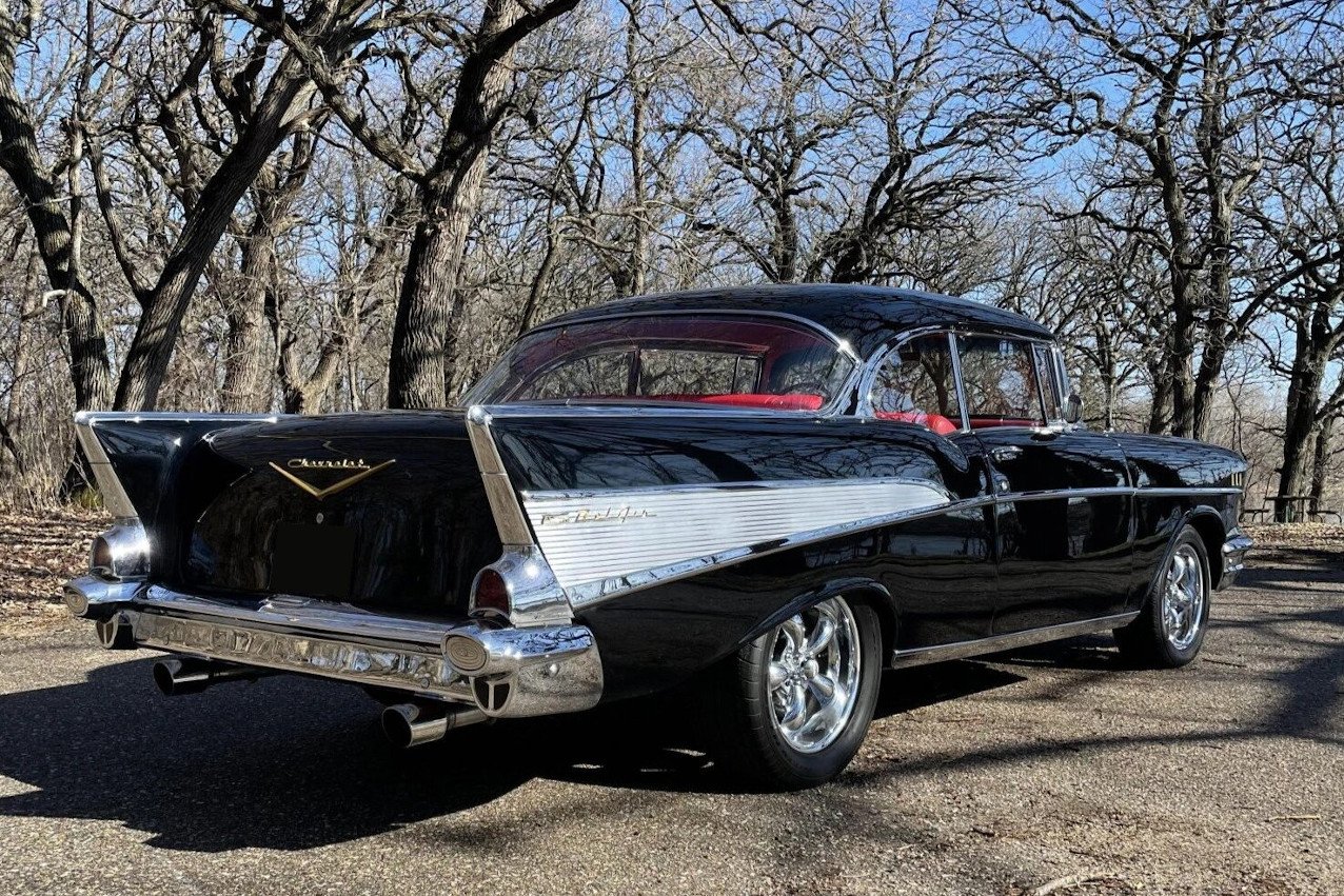 Power is supplied by a 283ci V8, and additional equipment includes an Edelbrock carburetor, exhaust headers and Borla mufflers, 17″ wheels, a Custom Autosound stereo unit, and a Vintage Air climate-control system.