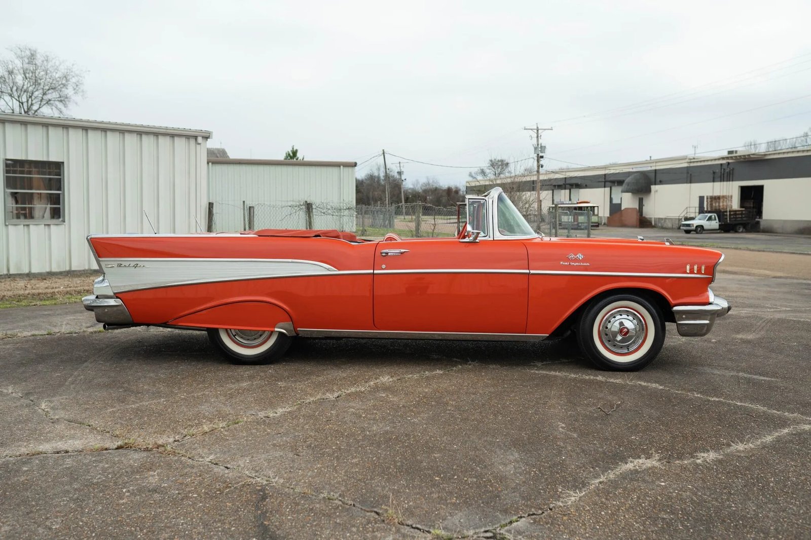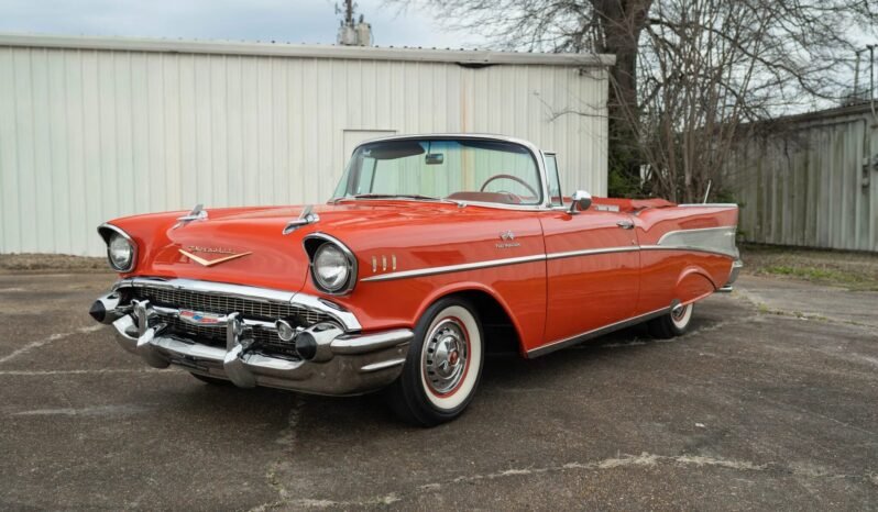 This 1957 Chevrolet Bel Air convertible is powered by a 283ci V8 equipped with Rochester fuel injection paired with a three-speed manual transmission. The car is finished in Matador Red over a two-tone interior, and additional features include a white convertible top, fender skirts, a Continental kit, and spinner-style wheel covers as well as a cabin heater, a cassette radio, and power steering.