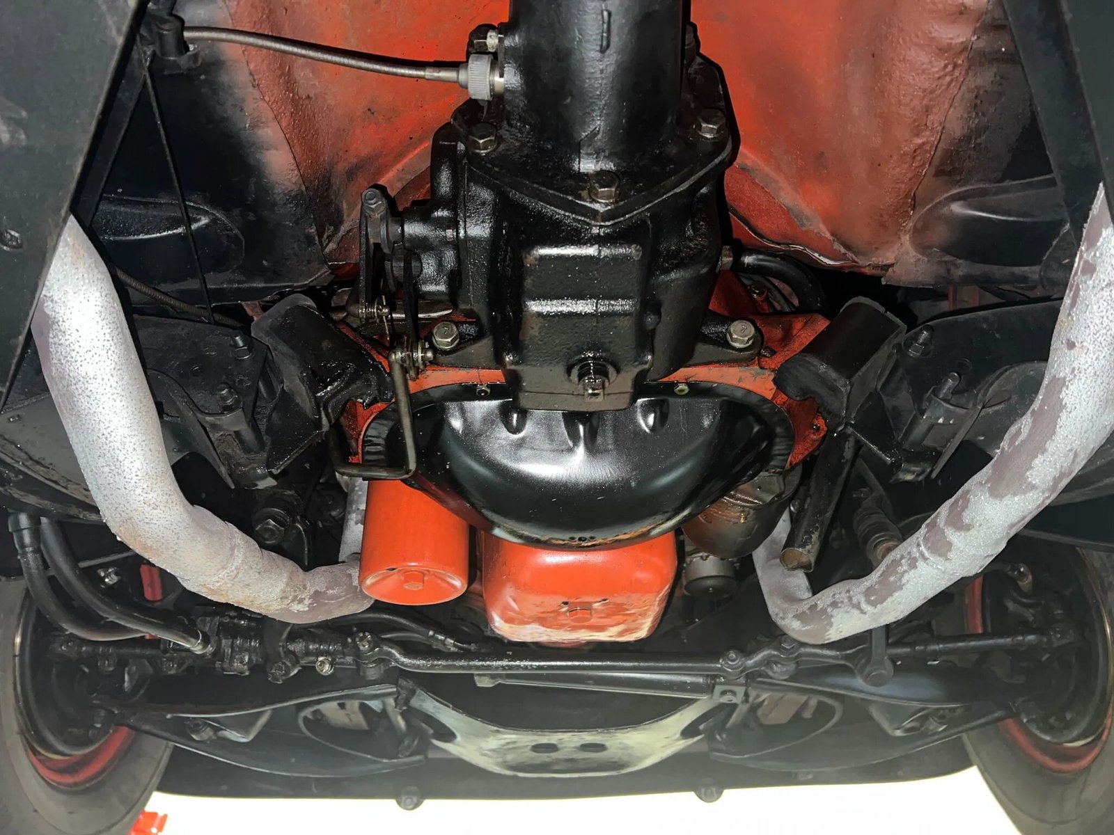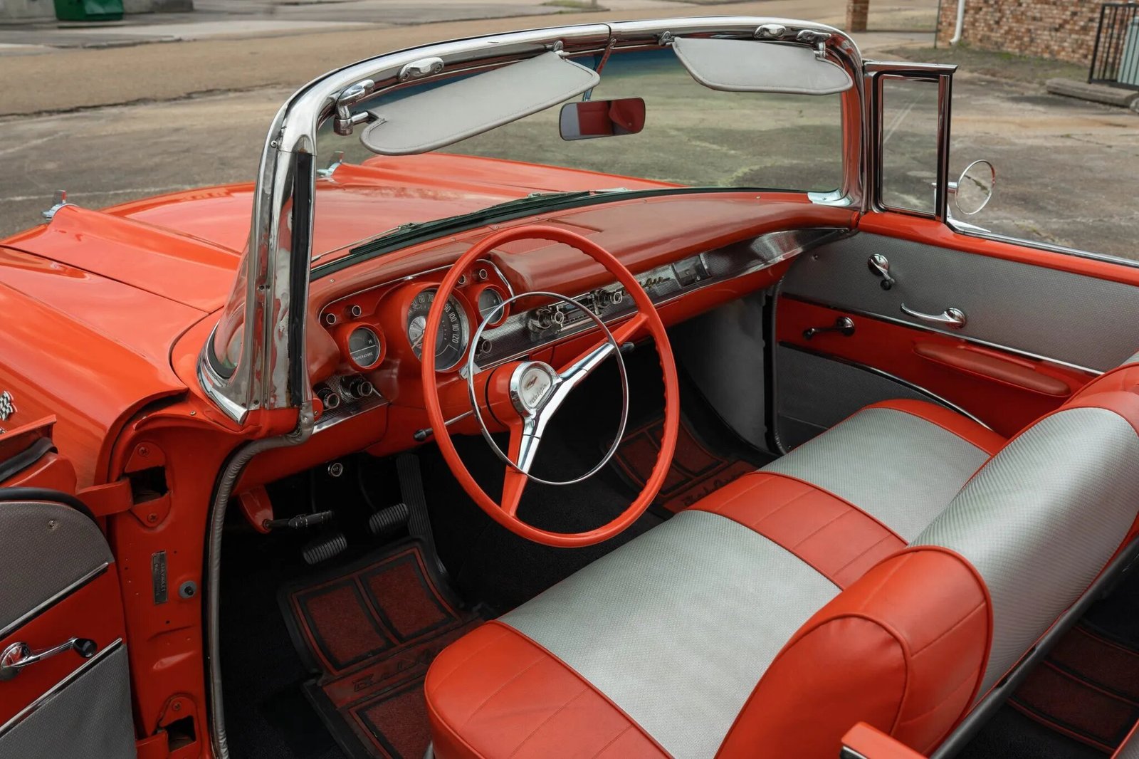 The body was previously finished in black, and it was repainted in its current Matador Red. Styling touches include an integrated front bumper and grille, twin windsplits mounted atop the hood, front-fender chevrons and fuel-injection badging, gold anodized trim, and ribbed-aluminum tail-fin inserts.