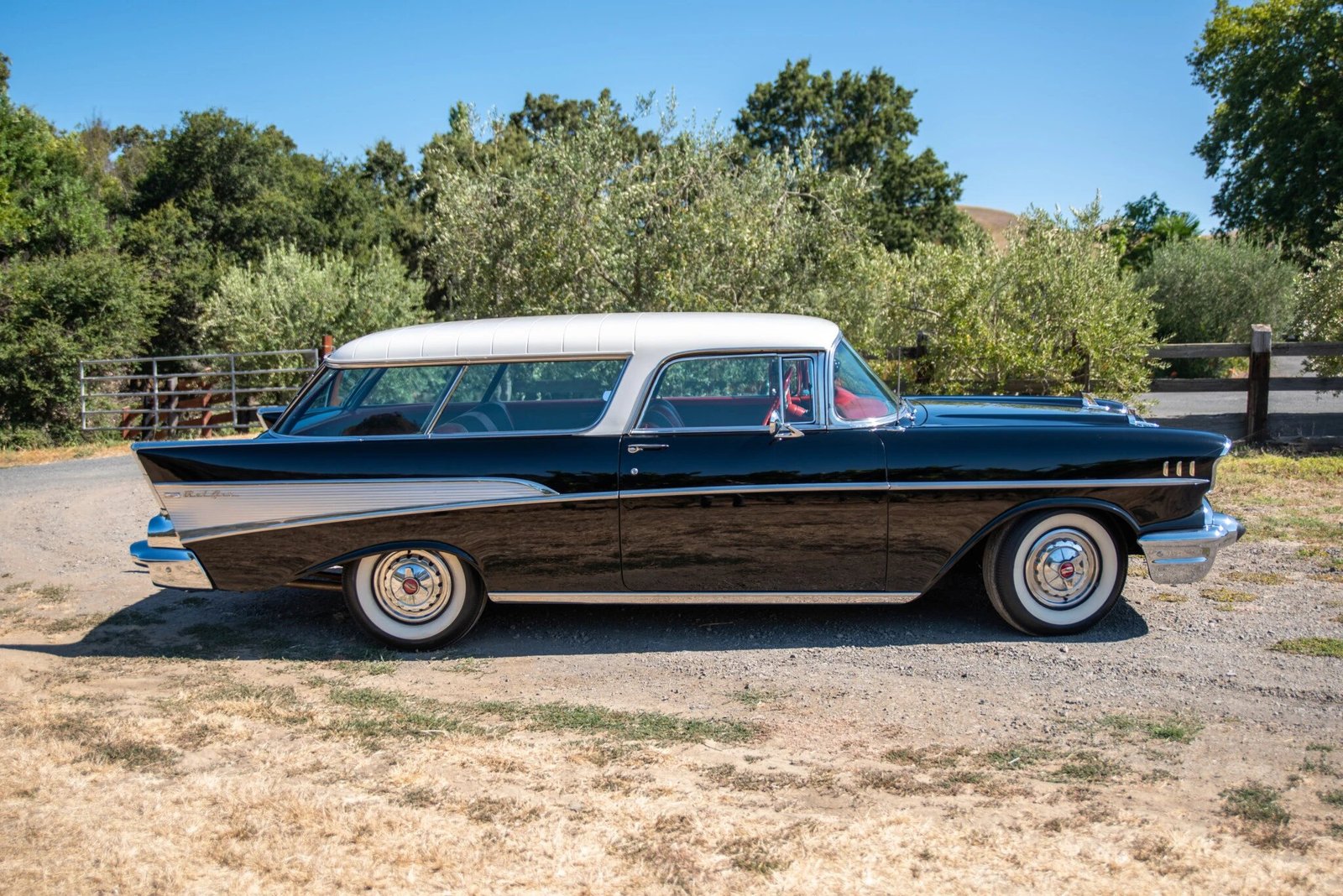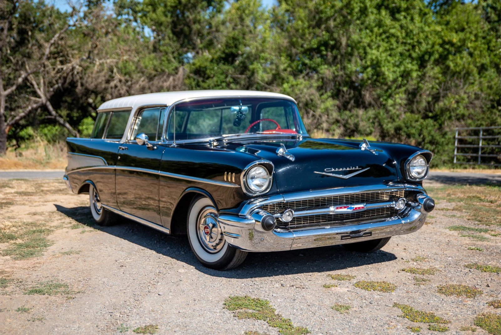 This 1957 Chevrolet Bel Air Nomad Station Wagon is finished in black and white over a red interior and is powered by a 283ci V8 paired with an automatic transmission.