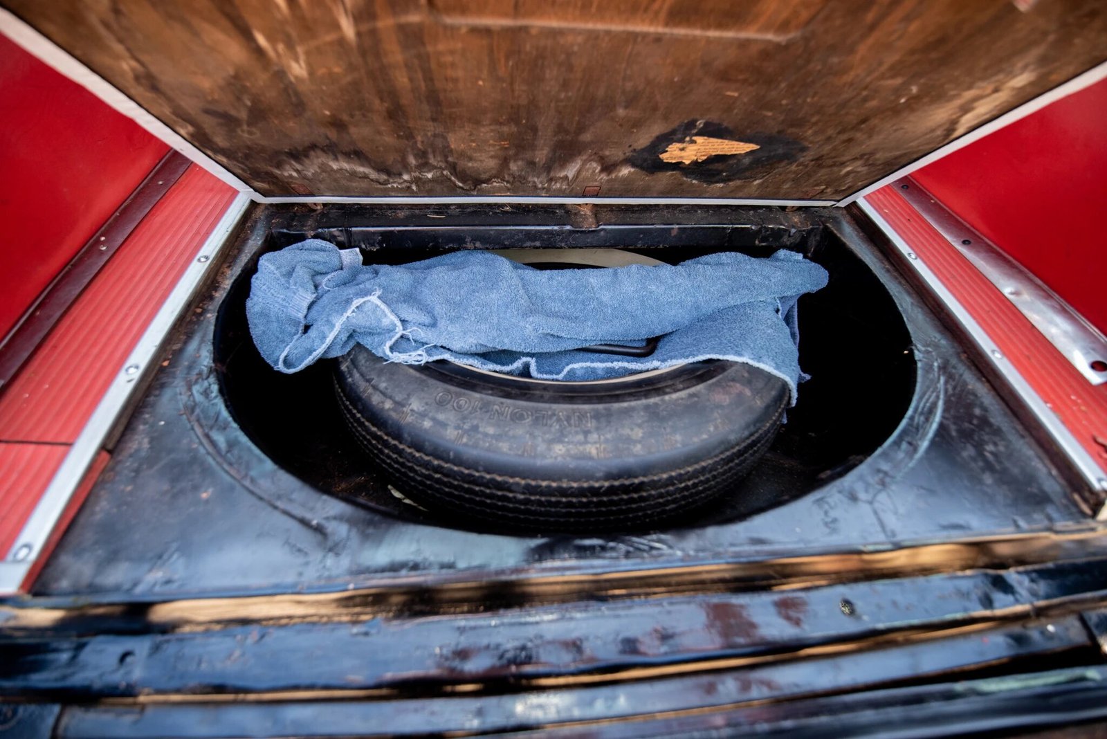 14″ steel wheels wear chrome hubcaps and Bedford wide-whitewall tires.
