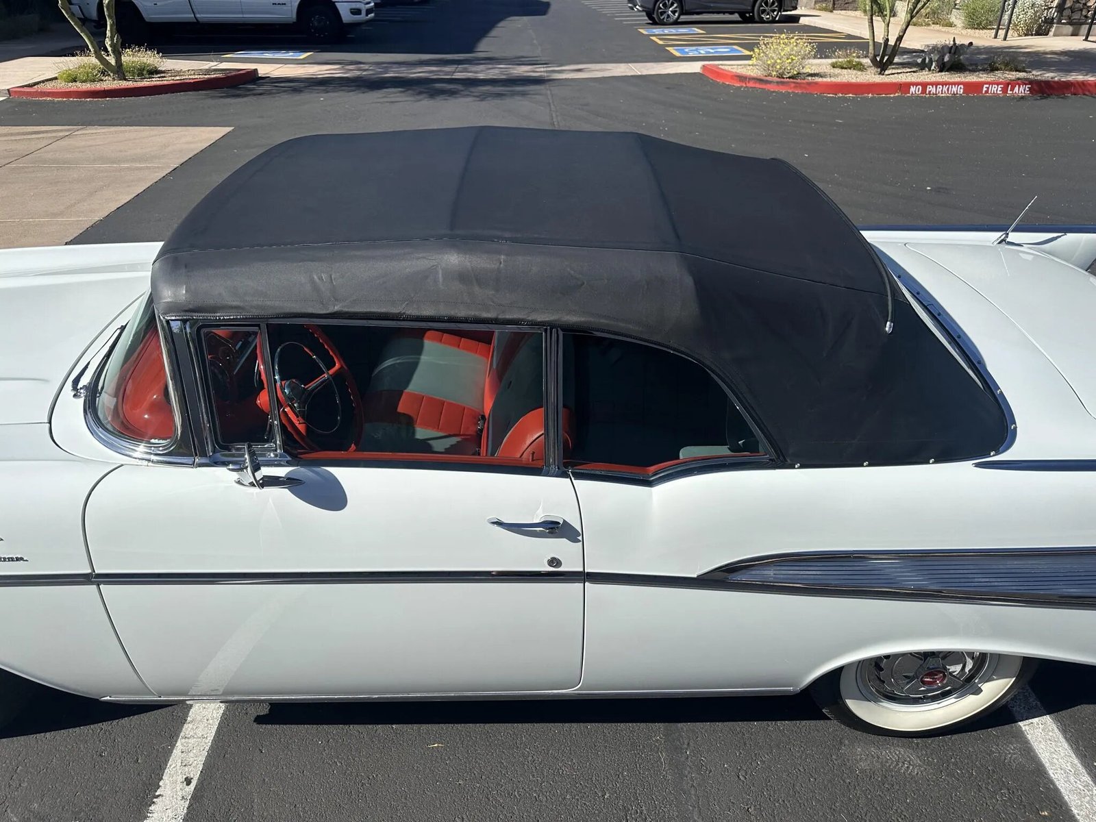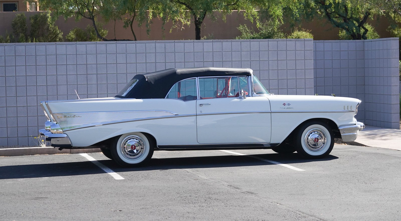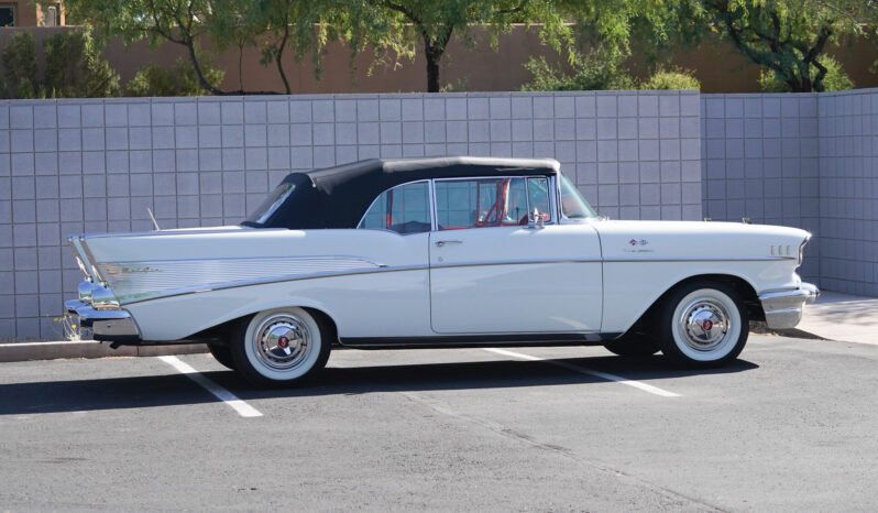 This 1957 Chevrolet Bel Air convertible is finished in Imperial Ivory over red and silver vinyl upholstery and powered by a fuel-injected 283ci V8 paired with a Turboglide automatic transmission. Equipment includes a power-operated black soft top, 14″ steel wheels, power-assisted steering and brakes, chrome bumpers and trim, power windows, a power front bench seat, and a Wonderbar AM radio.