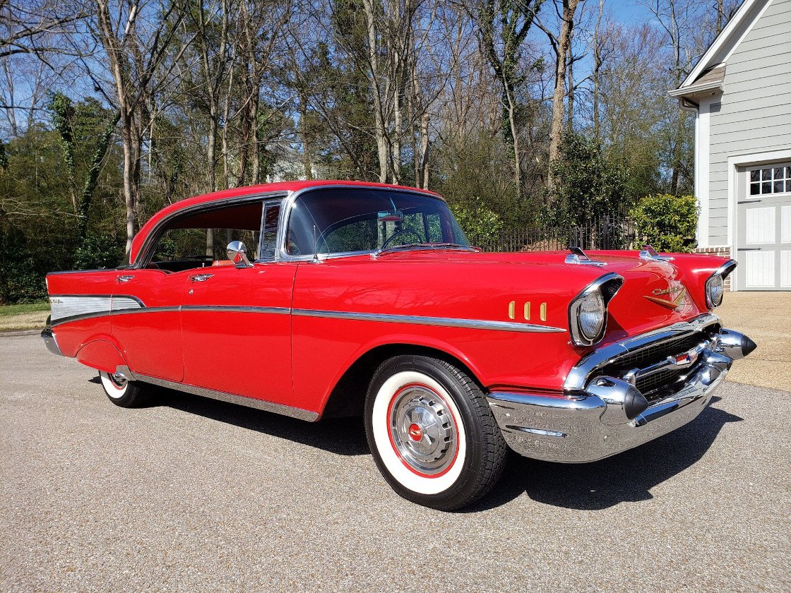 The gauges are just as flashy as in any other '57 model, including the separate pods for fuel level and temperature above that ribbon of bright metal trim.