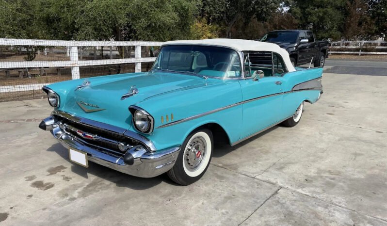 This 1957 Chevrolet Bel Air convertible is finished in turquoise over an ivory and turquoise interior and is powered by a 283ci V8 paired with a three-speed manual transmission.