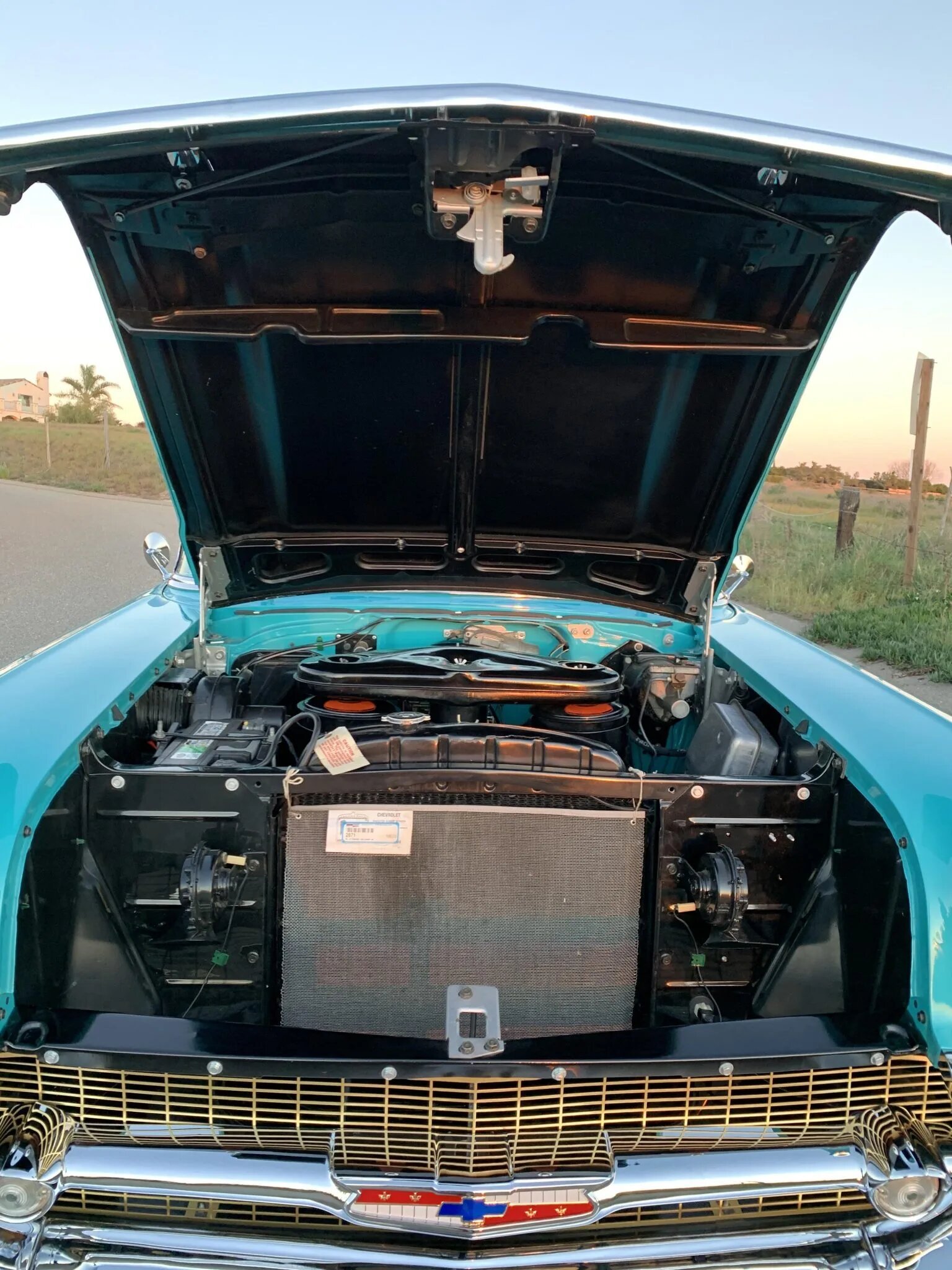 The 283ci V8 is equipped with dual four-barrel carburetors and a batwing air cleaner.