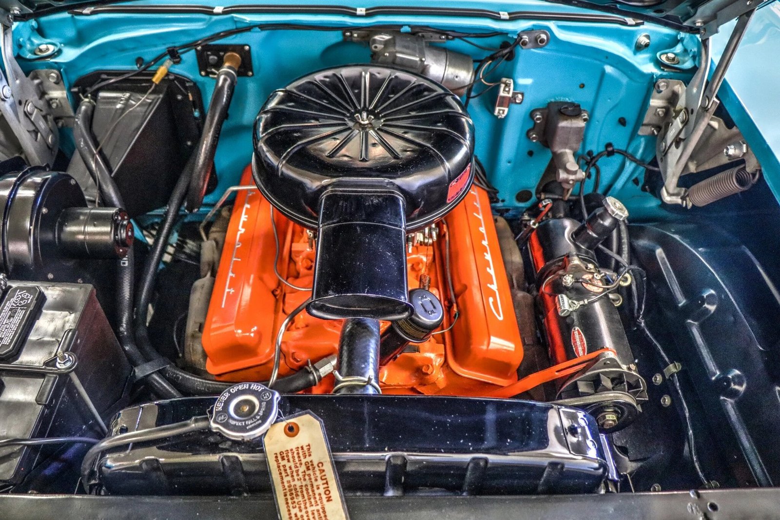 The 283ci V8 is original to the car, and the engine is equipped with Power Pack cylinder heads, a 4-barrel carburetor, and dual exhaust.