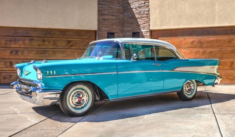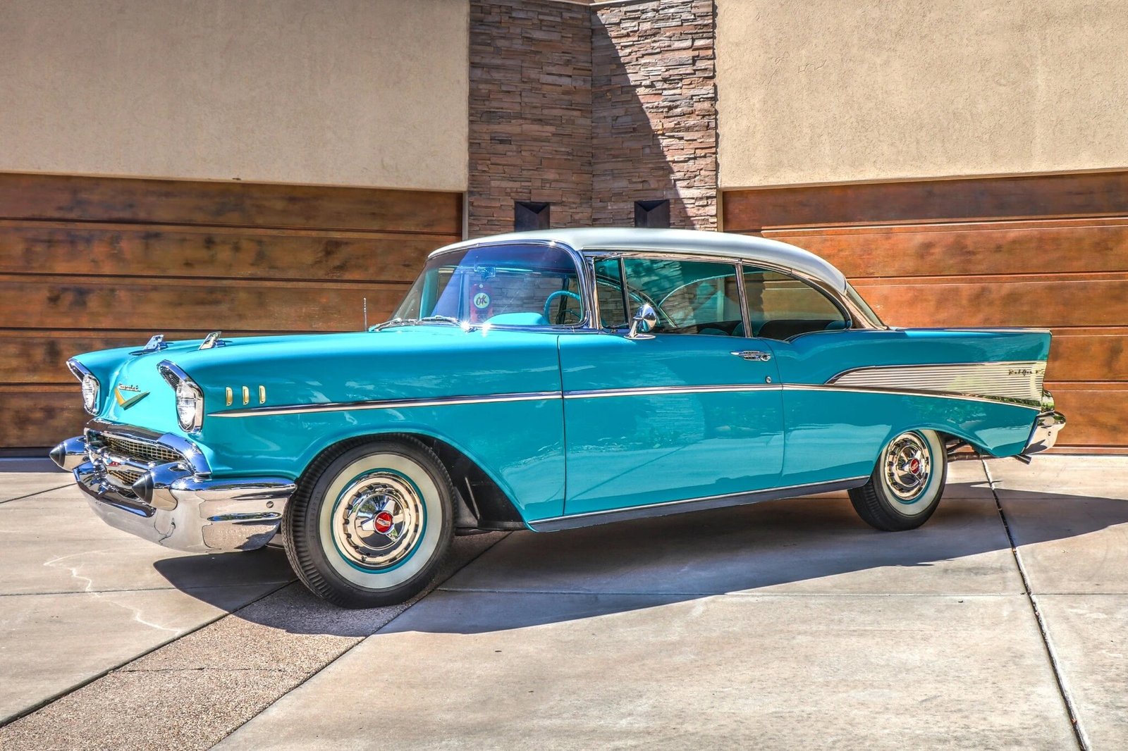 This 1957 Chevrolet Bel Air is a 2-door hardtop that underwent restoration in 2004, the car was refinished to factory specifications in its original Tropical Turquoise with gold exterior trim and features power seats, power steering, a Wonderbar radio, a tissue box, and more.