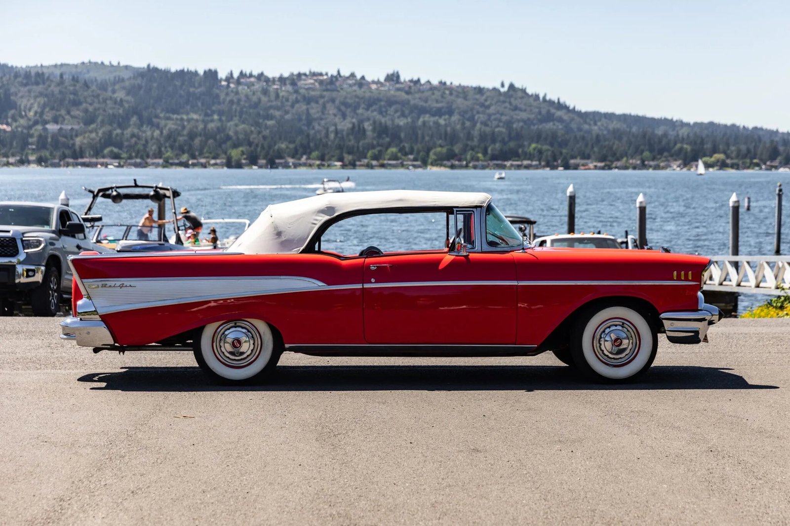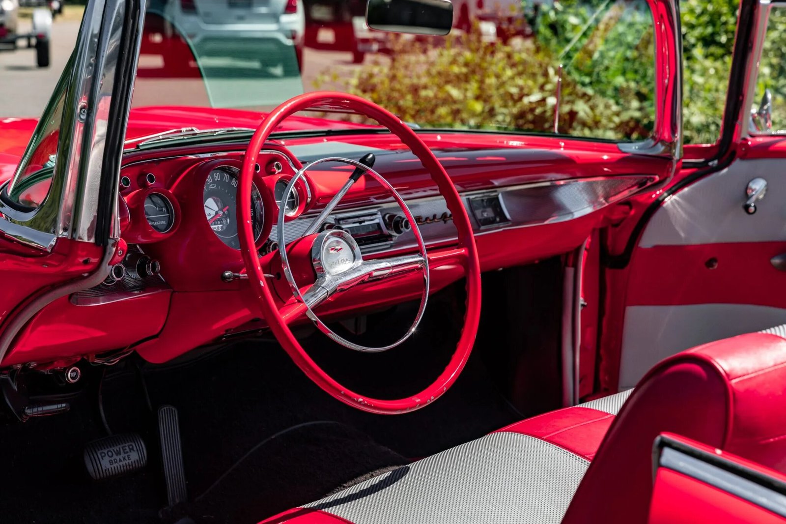 Features include a white power-operated soft top with a red convertible top boot, a Continental spare tire kit, Bel Air quarter panel badges, and chrome brightwork on the grille, bumpers, side moldings, light surrounds, window surrounds, and side mirrors.