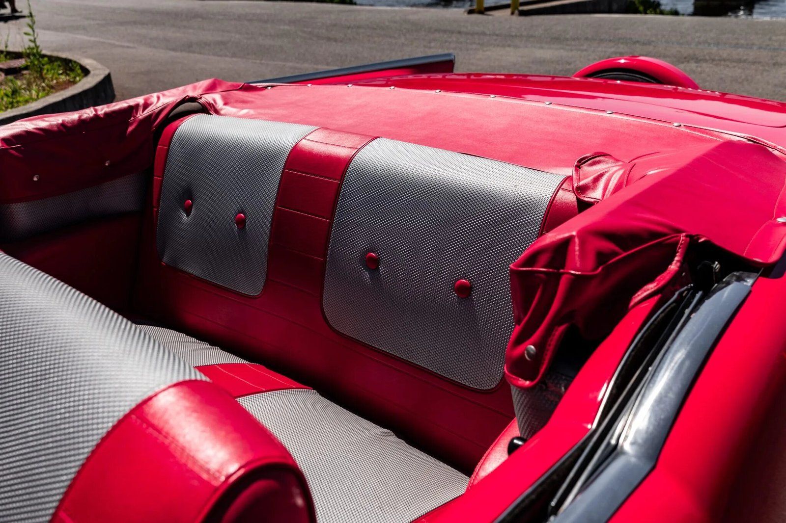 The front and rear bench seats are upholstered in red with gray accents and are complimented by color-coordinated door panels as well as a red dashboard and black carpets.