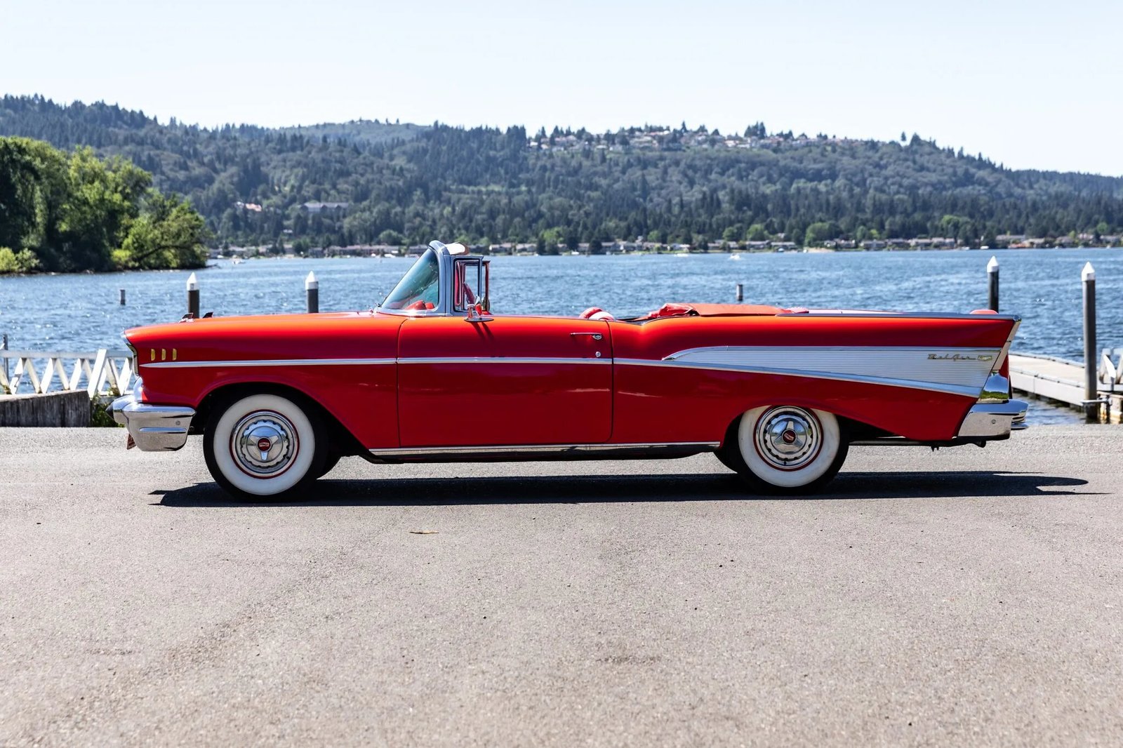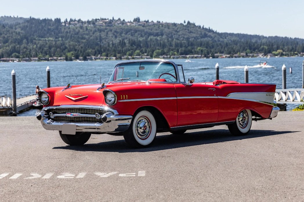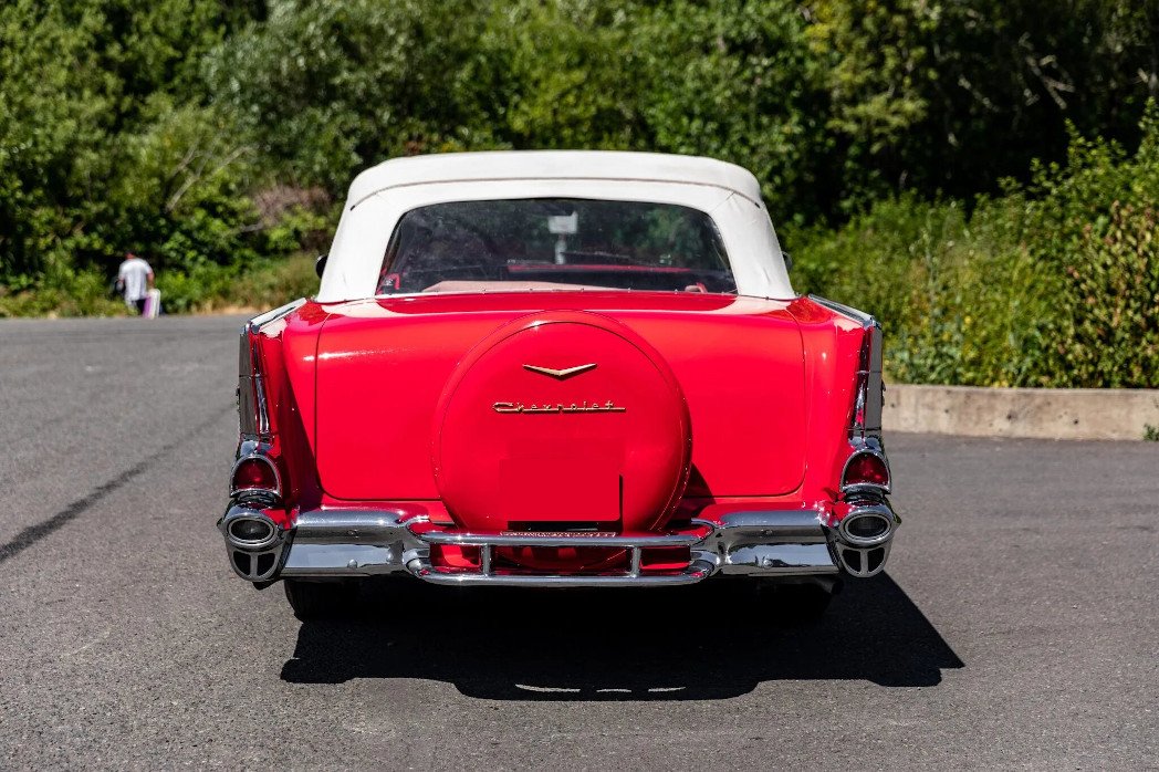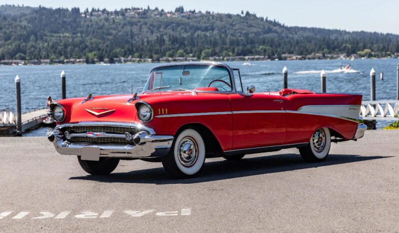 This 1957 Chevrolet Bel Air convertible is finished in red over red and gray upholstery and powered by a 283ci V8 paired with a two-speed automatic transmission.