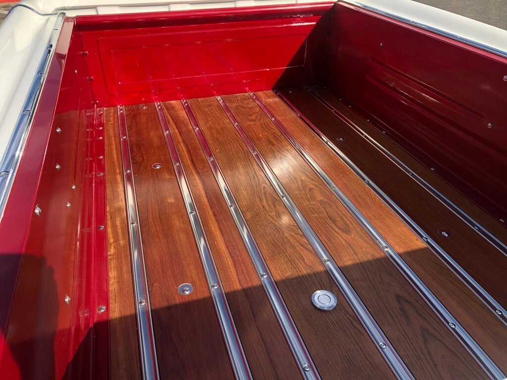 The truck underwent rust repair at the lower corners of the firewall prior to a repaint in white with red accents on the B-pillars, bedsides, and inner bed walls.