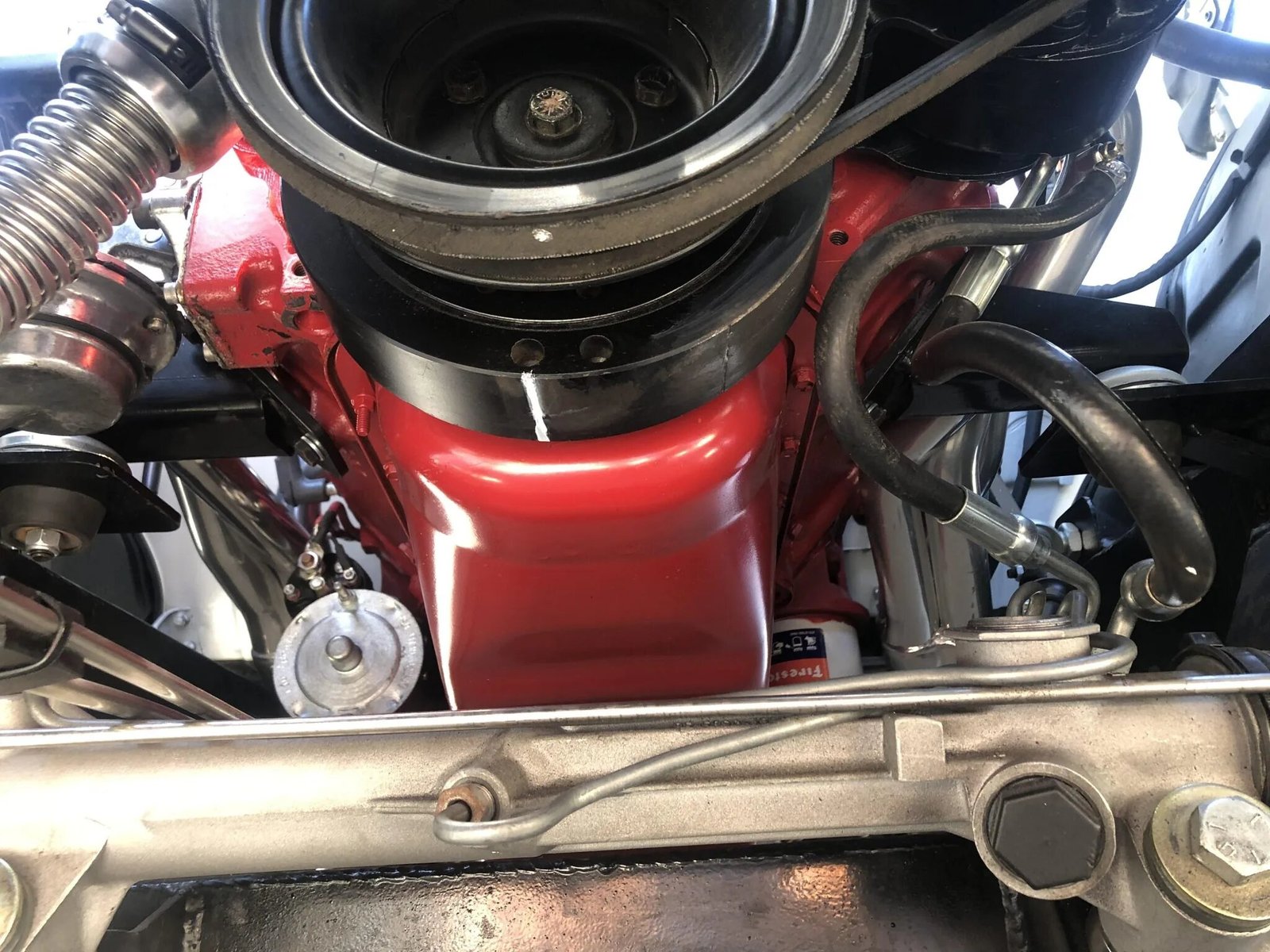 A subsequent body-off refurbishment included a repaint in white with red accents over a gray leather interior and the installation of a 350ci V8 mated to a four-speed automatic transmission.