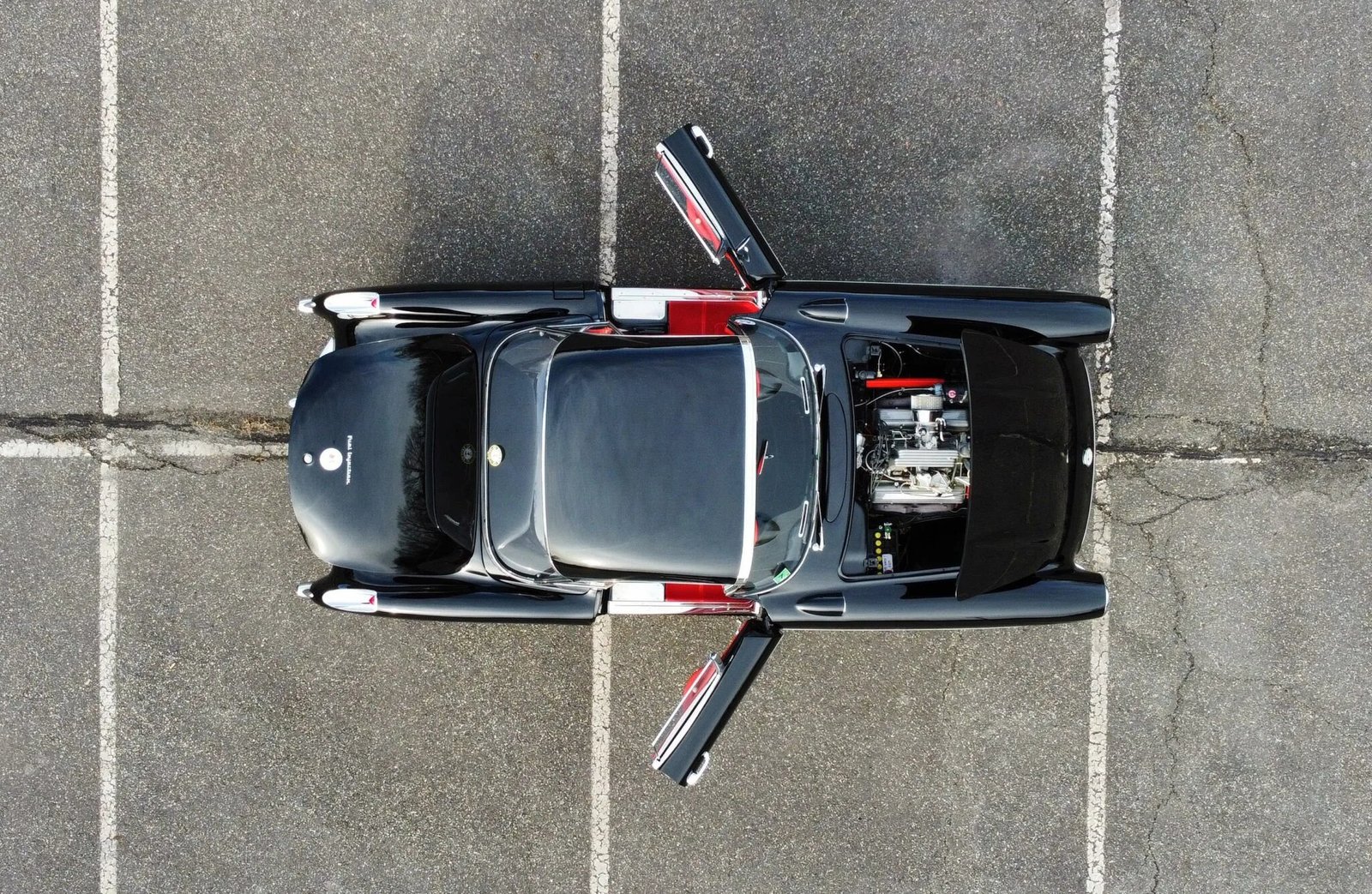 Features include a body-colored removable hardtop, bright-finished trim, a dual-outlet exhaust that exits through the rear bumper uprights, and a chrome grille, mirror, and bumperettes.