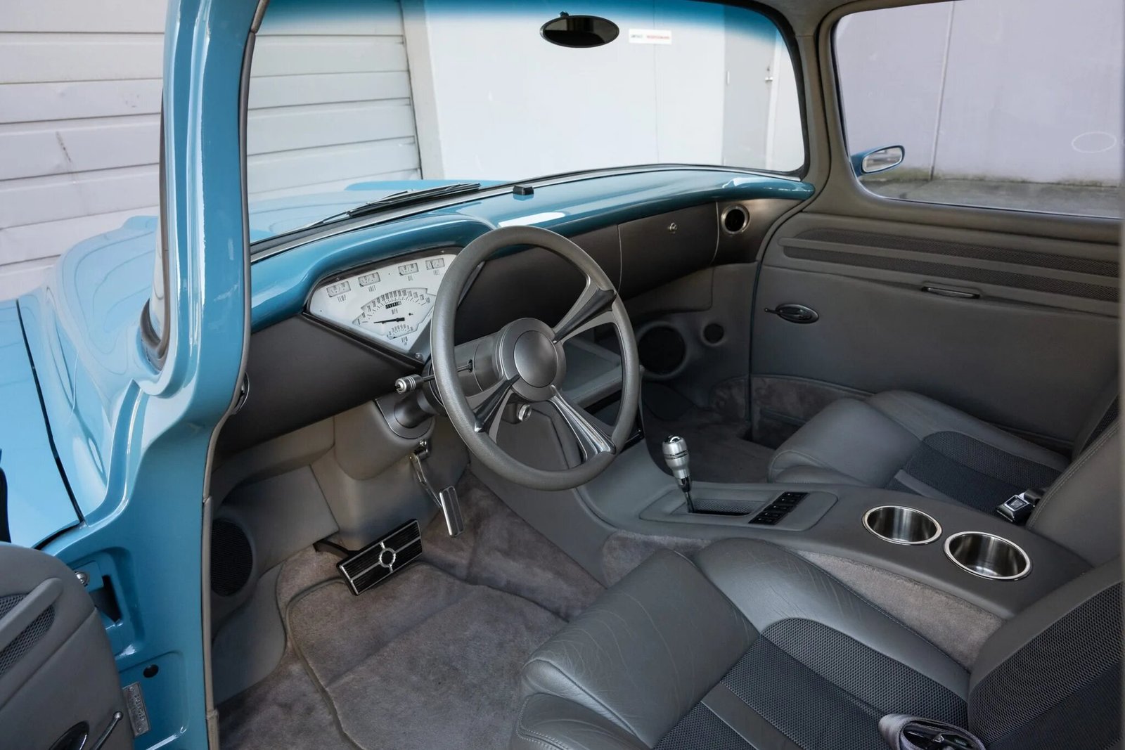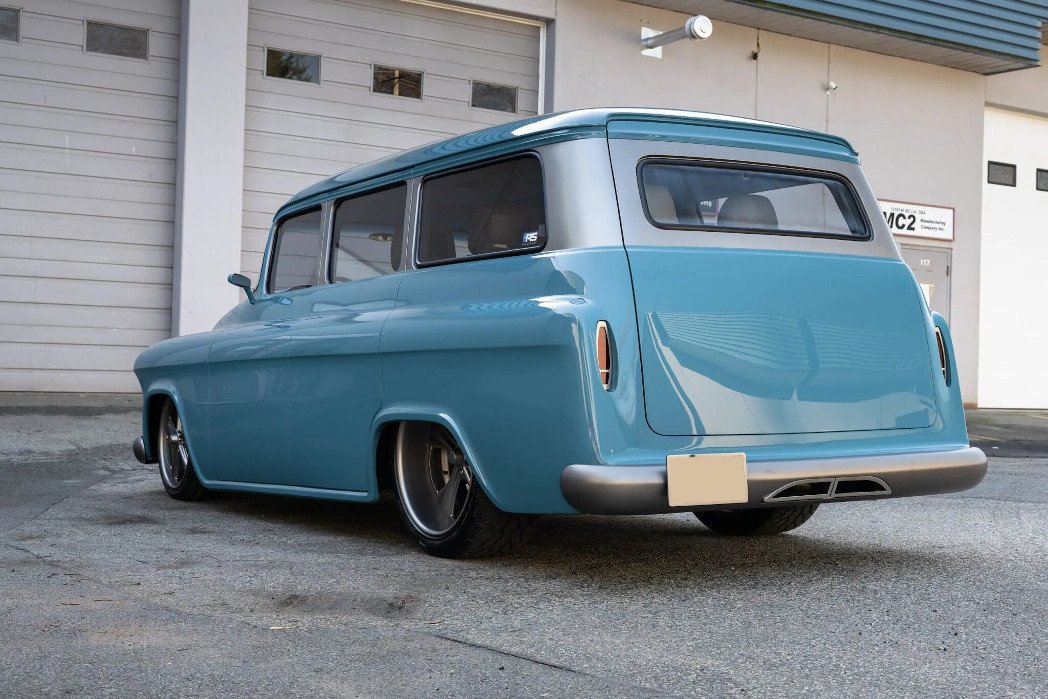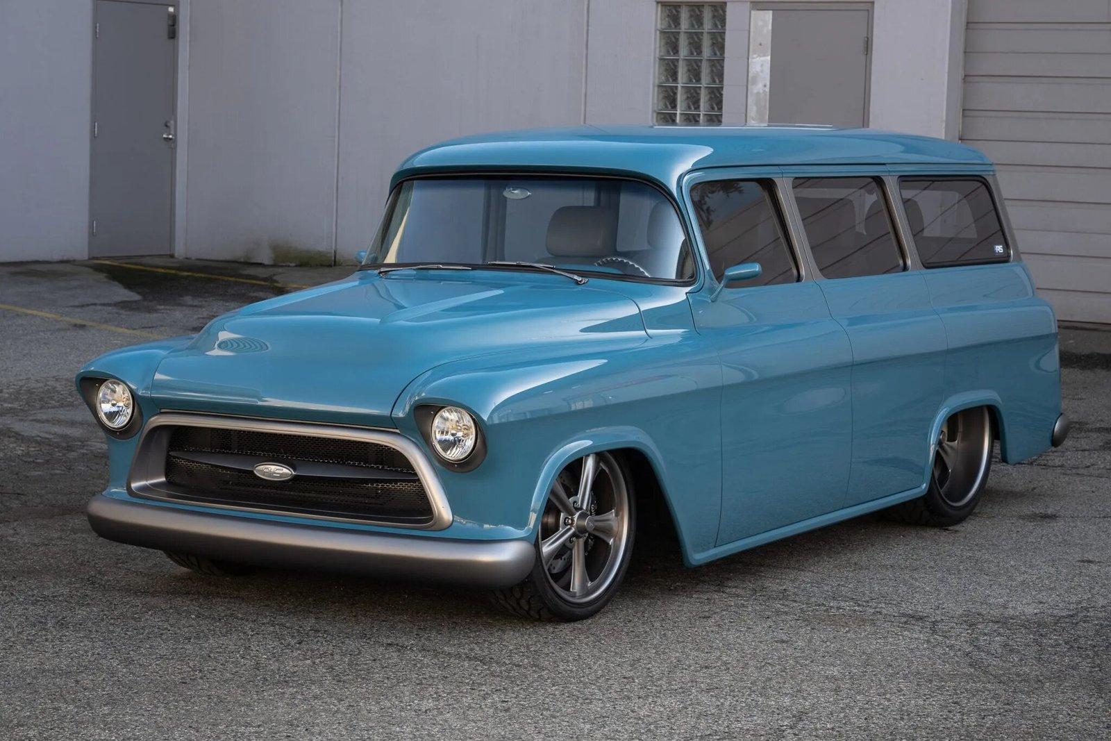This 1957 Chevrolet Suburban is finished in turquoise and silver over gray and powered by a supercharged 427ci LS7 V8 paired with a Bowler 4L85E four-speed automatic transmission and a TrueTrac Positraction differential.