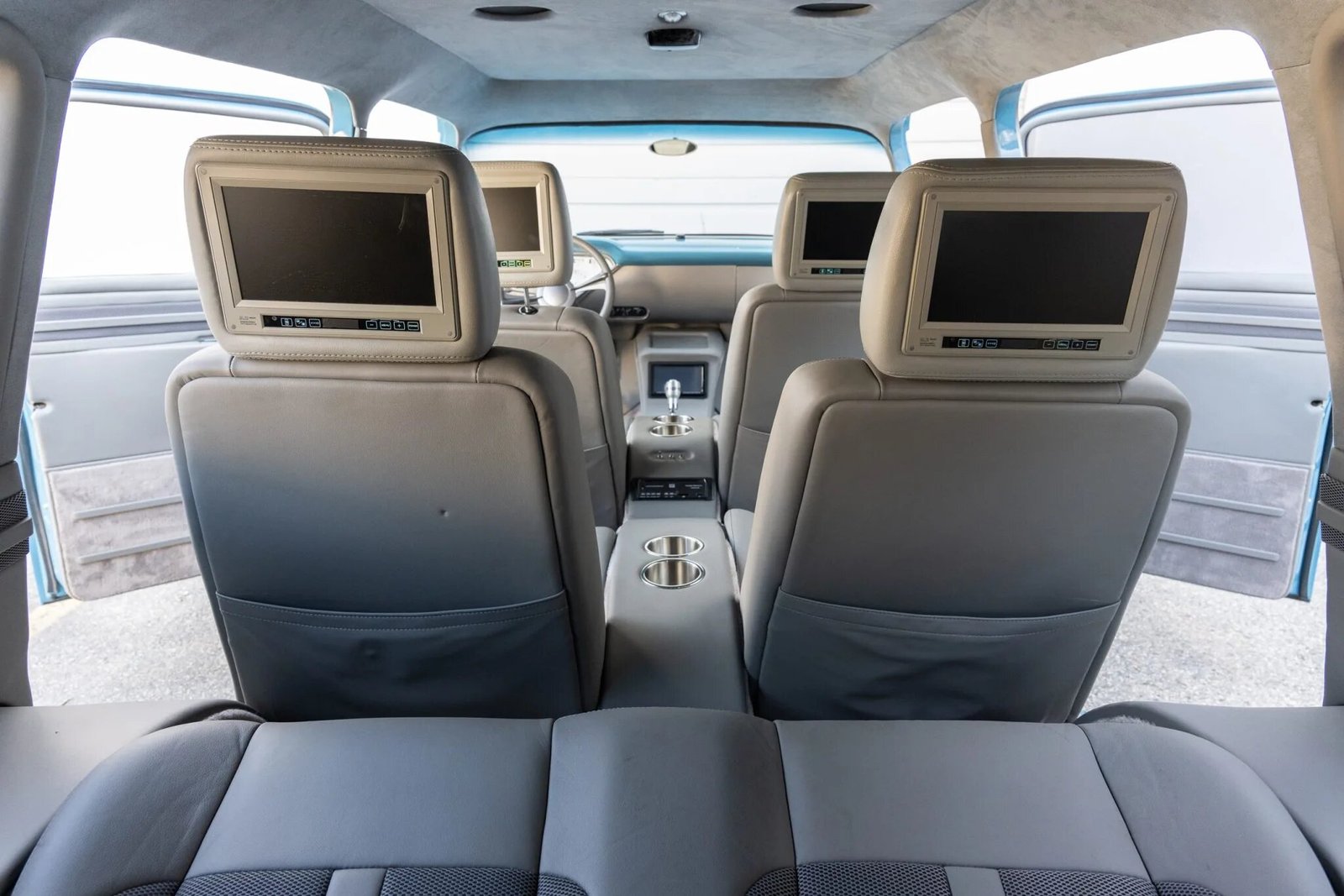 Features include a custom full-length center console with cup holders, a Lokar shifter, Vintage Air climate control, a custom audio system, headrest entertainment screens, power windows, custom door hardware, and a Kenwood touchscreen stereo.