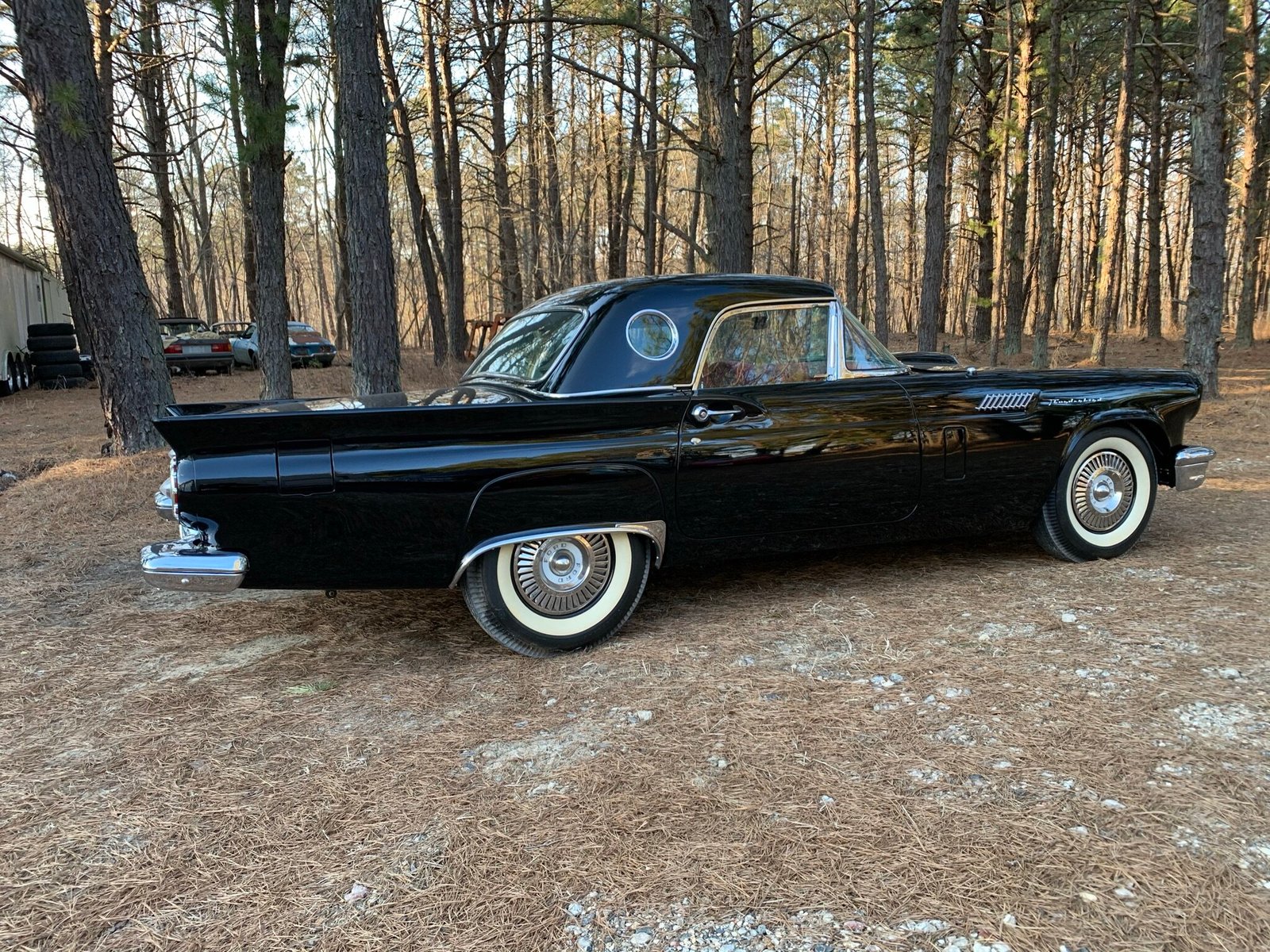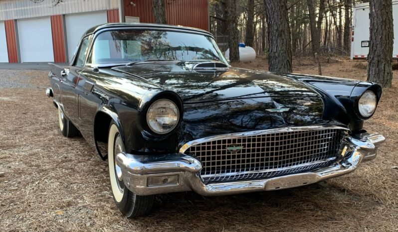 This 1957 Ford Thunderbird was finished in black over a red vinyl interior, and power is from a 312ci V8 mated to a three-speed automatic transmission. Additional equipment includes a color-matched removable hardtop, power steering and brakes, fender skirts, a heater/defroster, and a push-button AM radio.