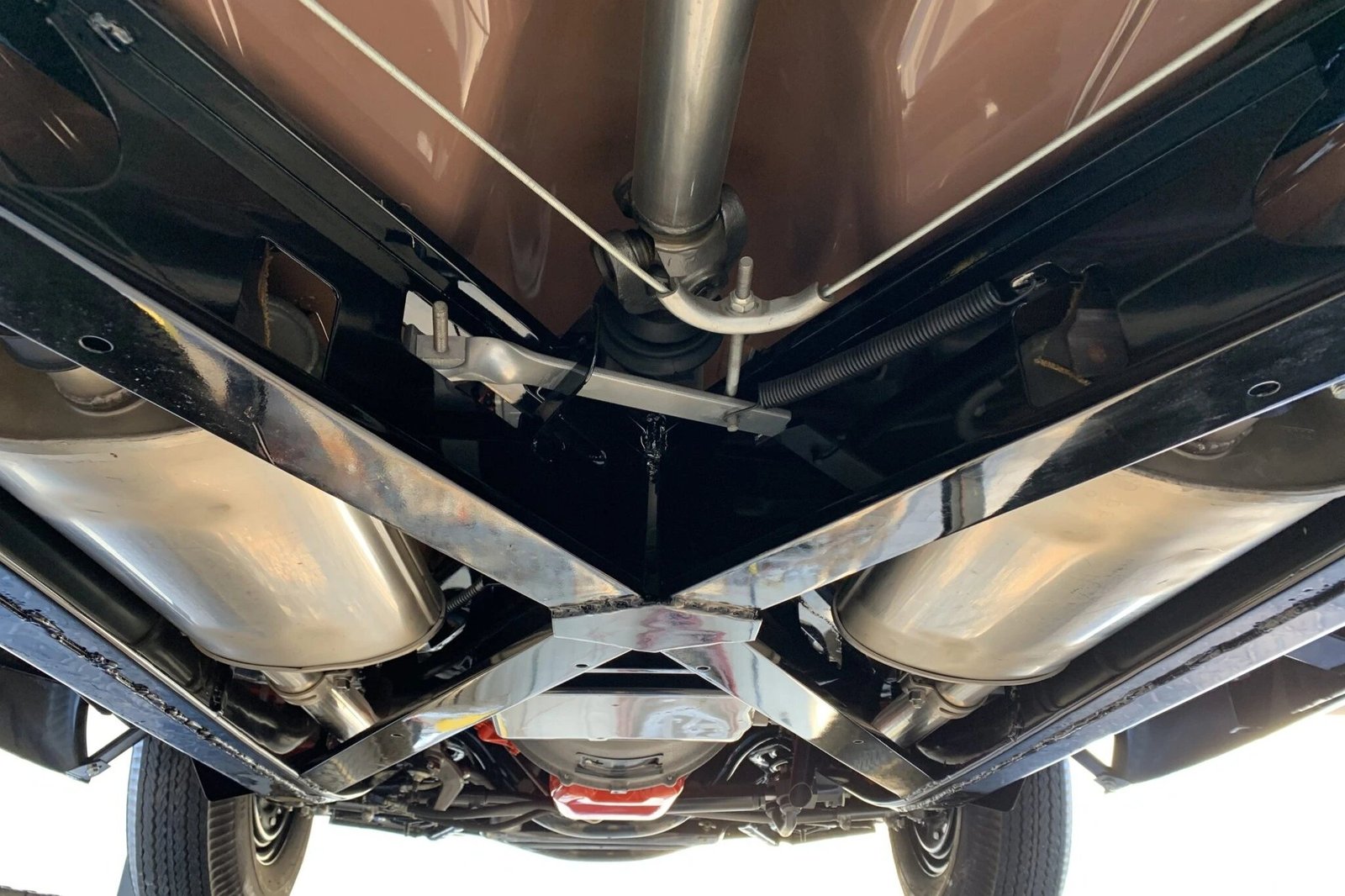 The body was removed from the frame prior to being refinished in its current black during the early 2000s work.