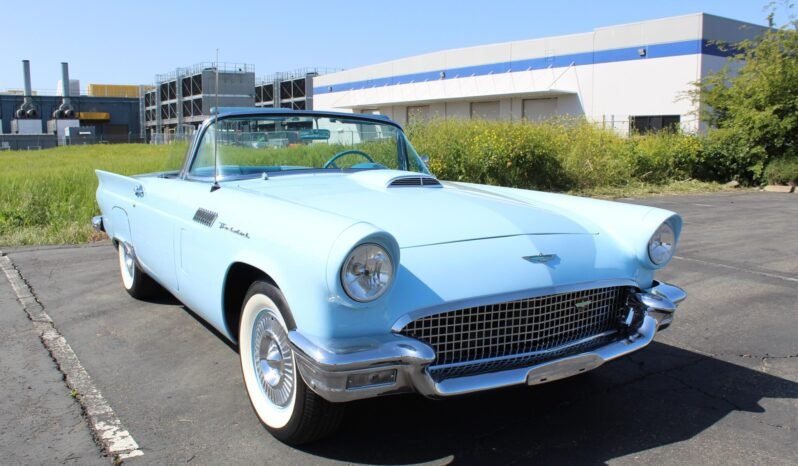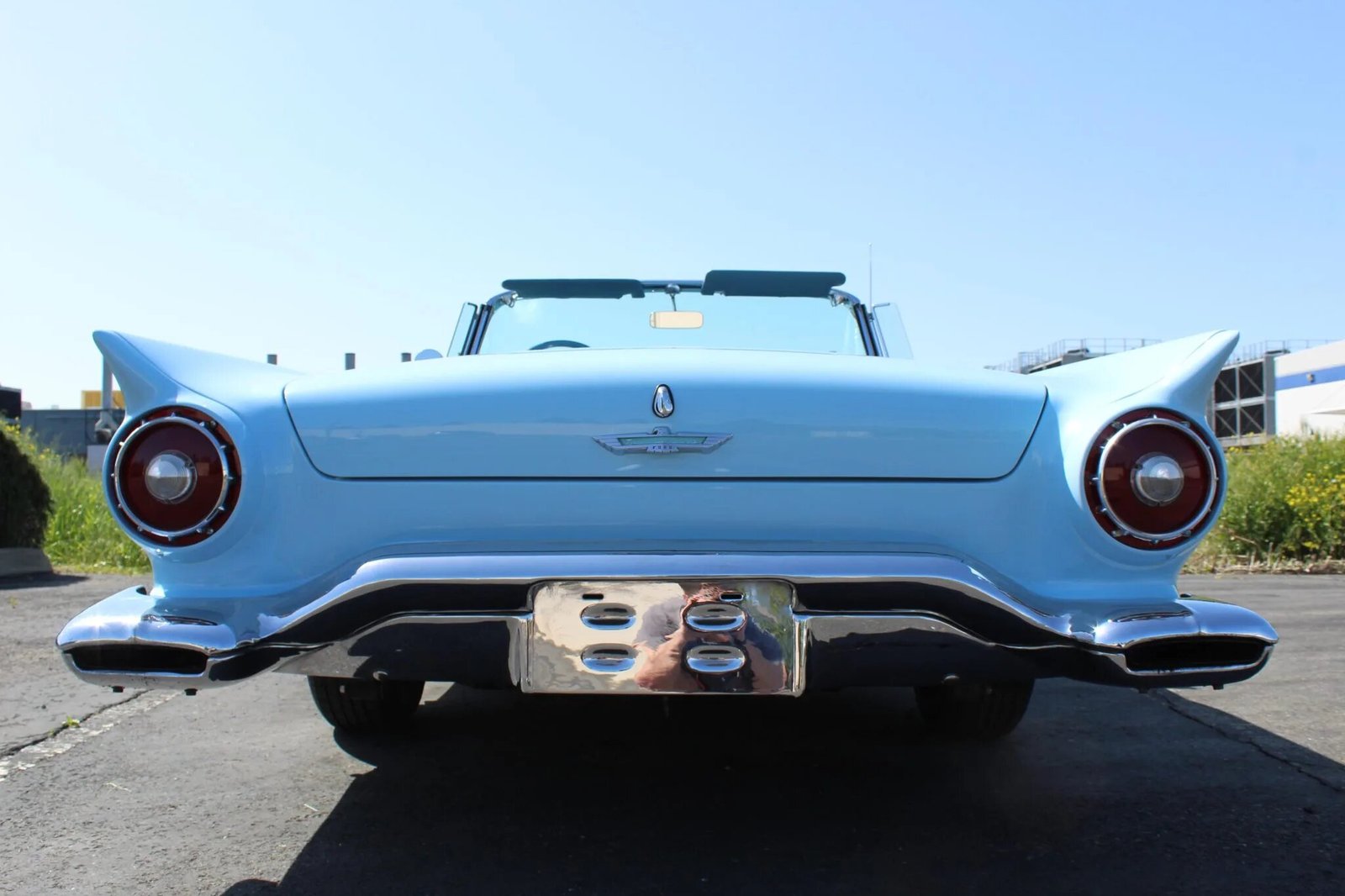 Equipment includes a replacement darker blue convertible top, a Thunderbird hood emblem, a driver-side mirror, shaped and chromed front and rear bumpers, fender vents, aftermarket headlamps, bumper-mounted parking lights, a fixed antenna, and slanted tail fins.