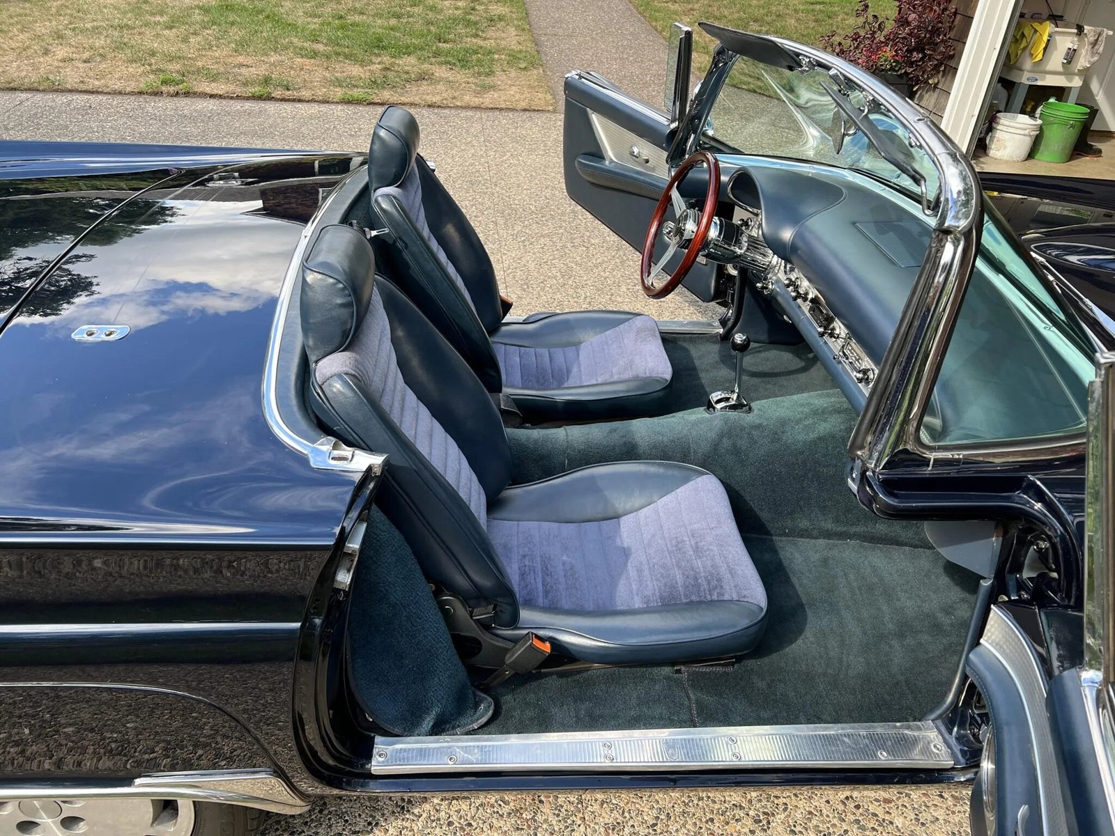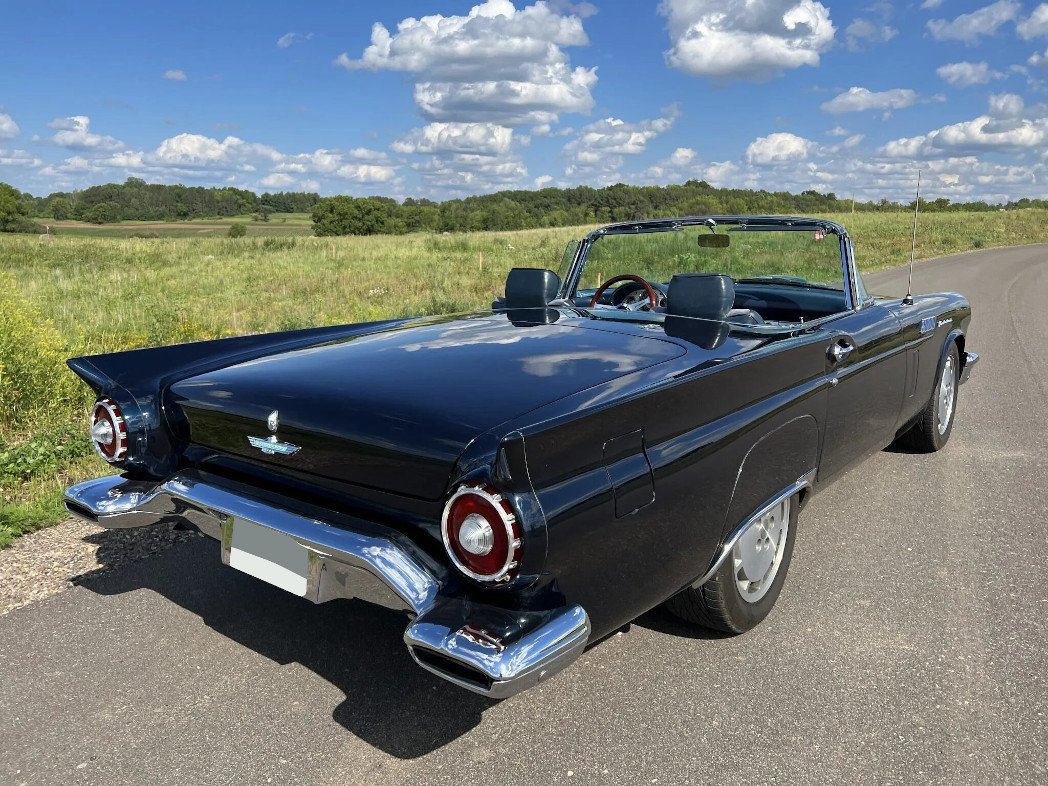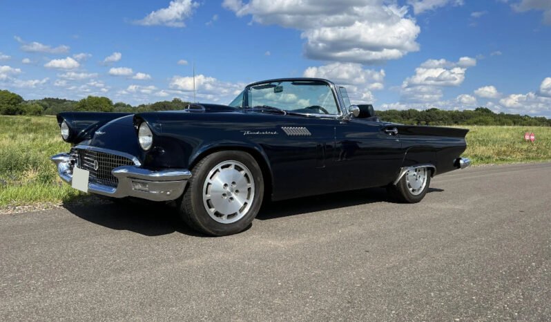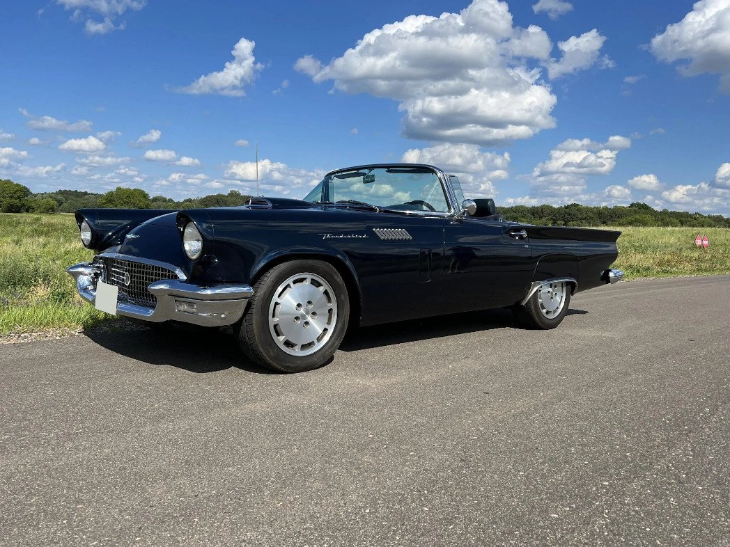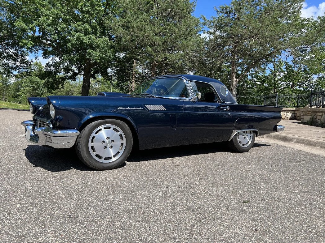 This 1957 Ford Thunderbird was acquired in 1961, and modifications in the 1990s included installing a 400ci Chevrolet V8, a 700R4 four-speed automatic transmission, front and rear 1988 Corvette suspension, engine cradle, power steering rack, ABS system, and braking components, air conditioning, Lamborghini Espada seats, and as well as replacing the valve springs in 2020. This blue-over-blue example features a Haartz convertible soft top, a removable body-color hardtop, Koni shock absorbers, power windows, power brakes and steering, Holley HP multi-port fuel injection with ignition control Hooker headers, and a custom dual exhaust system.