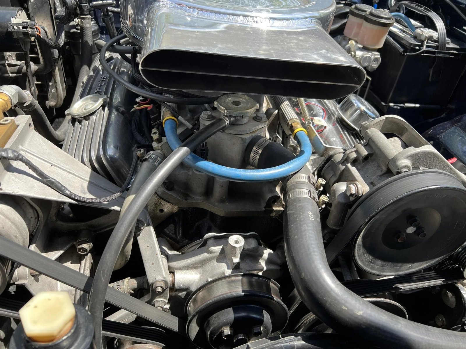 The replacement 400ci Chevrolet V8 was installed in the late 1990s and features Holley HP multi-port fuel injection with ignition control, a polished air cleaner assembly, an aluminum radiator with an electric fan, Edelbrock finned valve covers, electronic ignition, and Hooker headers. Power is delivered to the rear wheels through a replacement 700R4 four-speed automatic transmission.