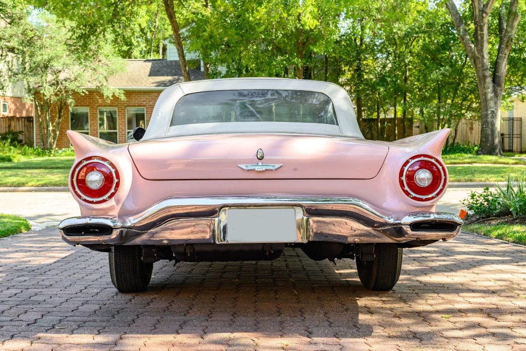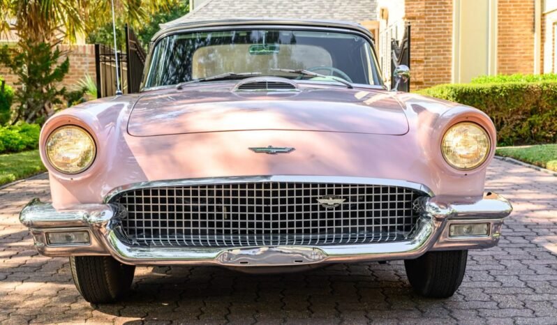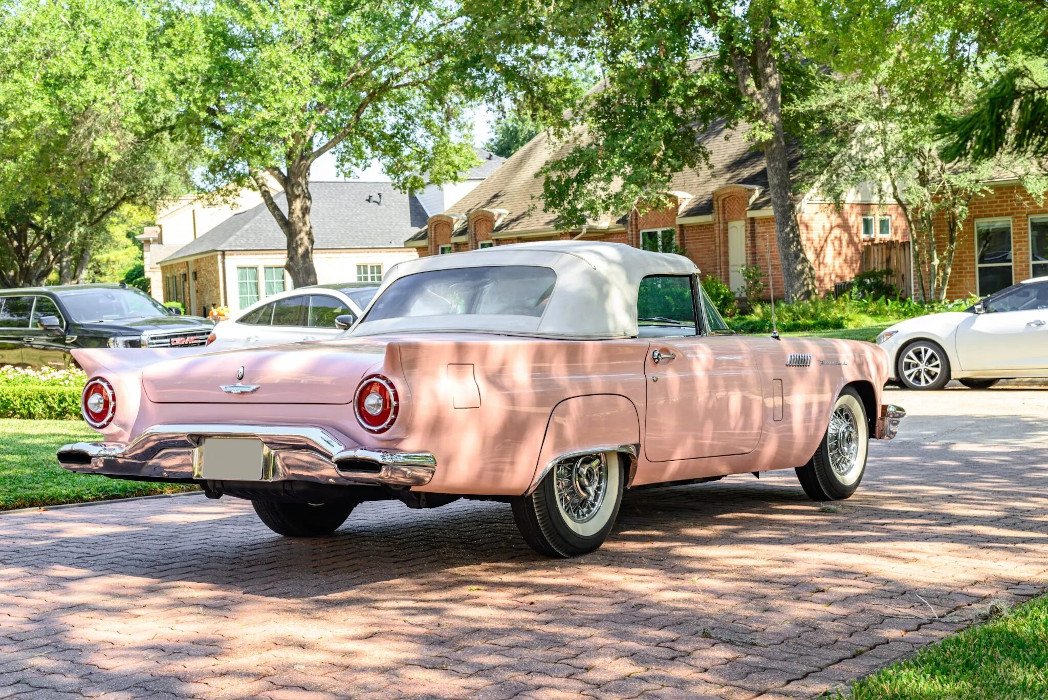 This 1957 Ford Thunderbird is finished in Dusk Rose over white vinyl upholstery and is powered by a 312ci V8 paired with a three-speed automatic transmission. Work consisted of overhauling the transmission, rebuilding the power steering hoses, and replacing the carburetor, oil pan gasket, and starter solenoid and motor. Equipment includes a removable white hardtop, rear fender skirts, 14″ wire wheels, power steering and brakes, under-dash air conditioning, electric windows, and a cassette radio.
