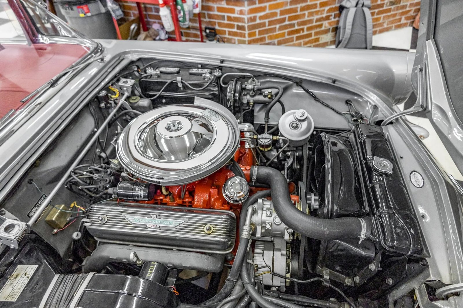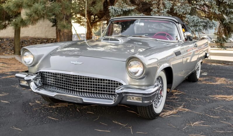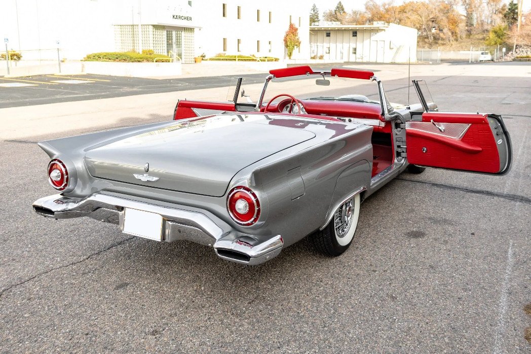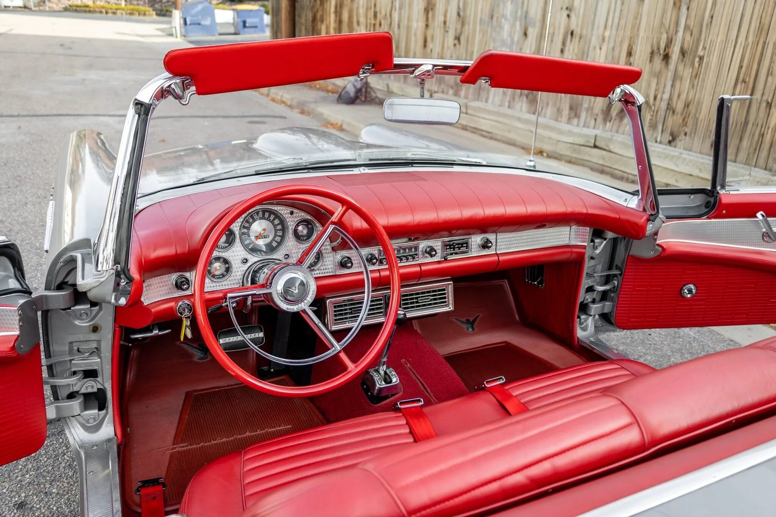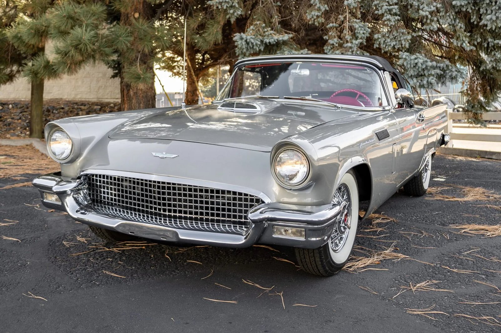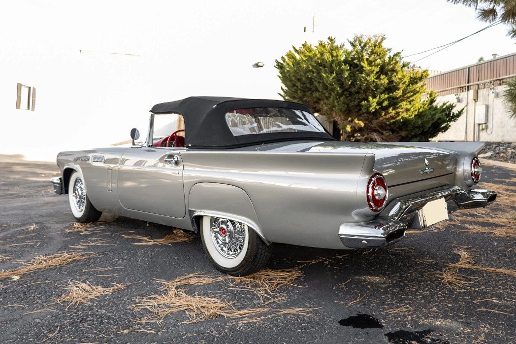 This 1957 Ford Thunderbird is finished in gray over red leather upholstery and is powered by a 312ci V8 paired with a three-speed automatic transmission. Equipment includes a black soft top, a four-barrel carburetor, 14″ wire wheels, Coker Classic whitewall tires, power-assisted steering, electric windows, air conditioning, and a push-button Town & Country radio.