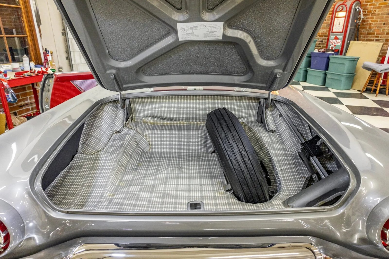 The car left the factory finished in Gunmetal Gray (H) and have been repainted during the refurbishment at Amos Minter’s Thunderbirds. Exterior details include a black soft top, chrome bumpers, a hood scoop, faux fender vents, a left side mirror, rear wheel skirts, and integrated dual exhaust outlets.