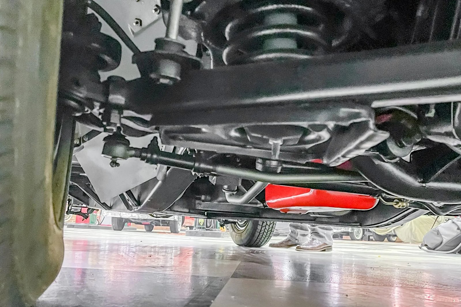 Chrome 14″ wire wheels wear three-eared spinners and 205/75 Coker Classic whitewall tires. A full-size spare is stored in the trunk. The car is equipped with power-assisted steering and drum brakes at each corner.