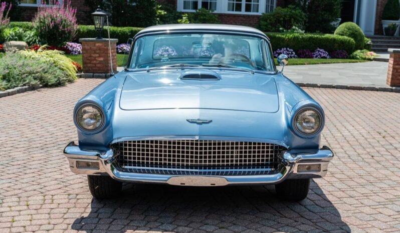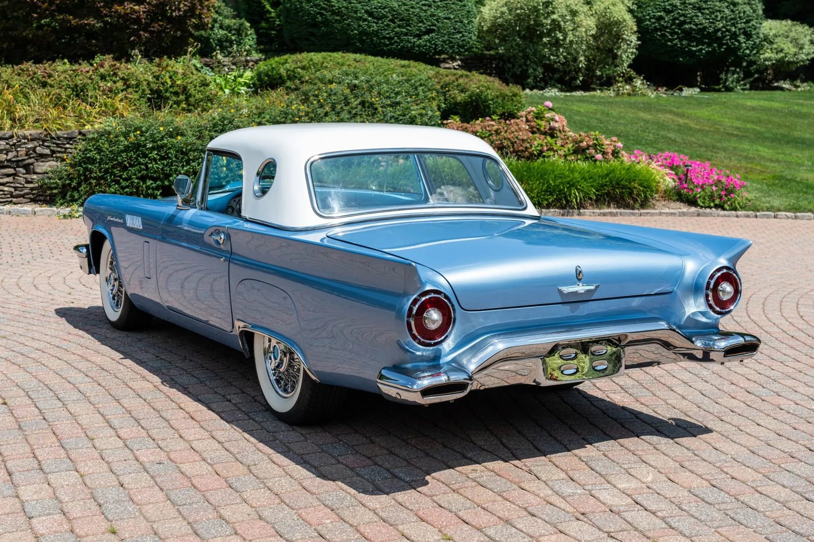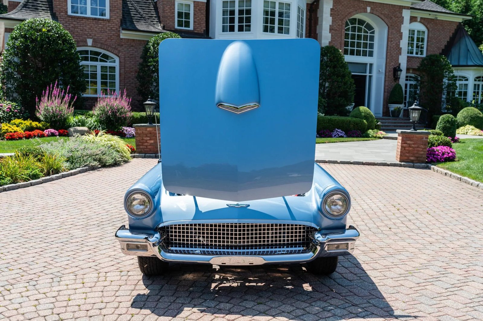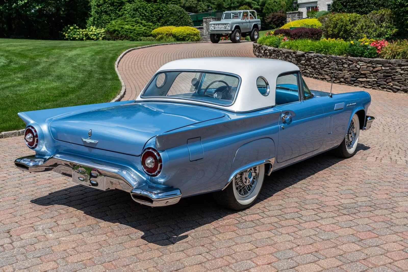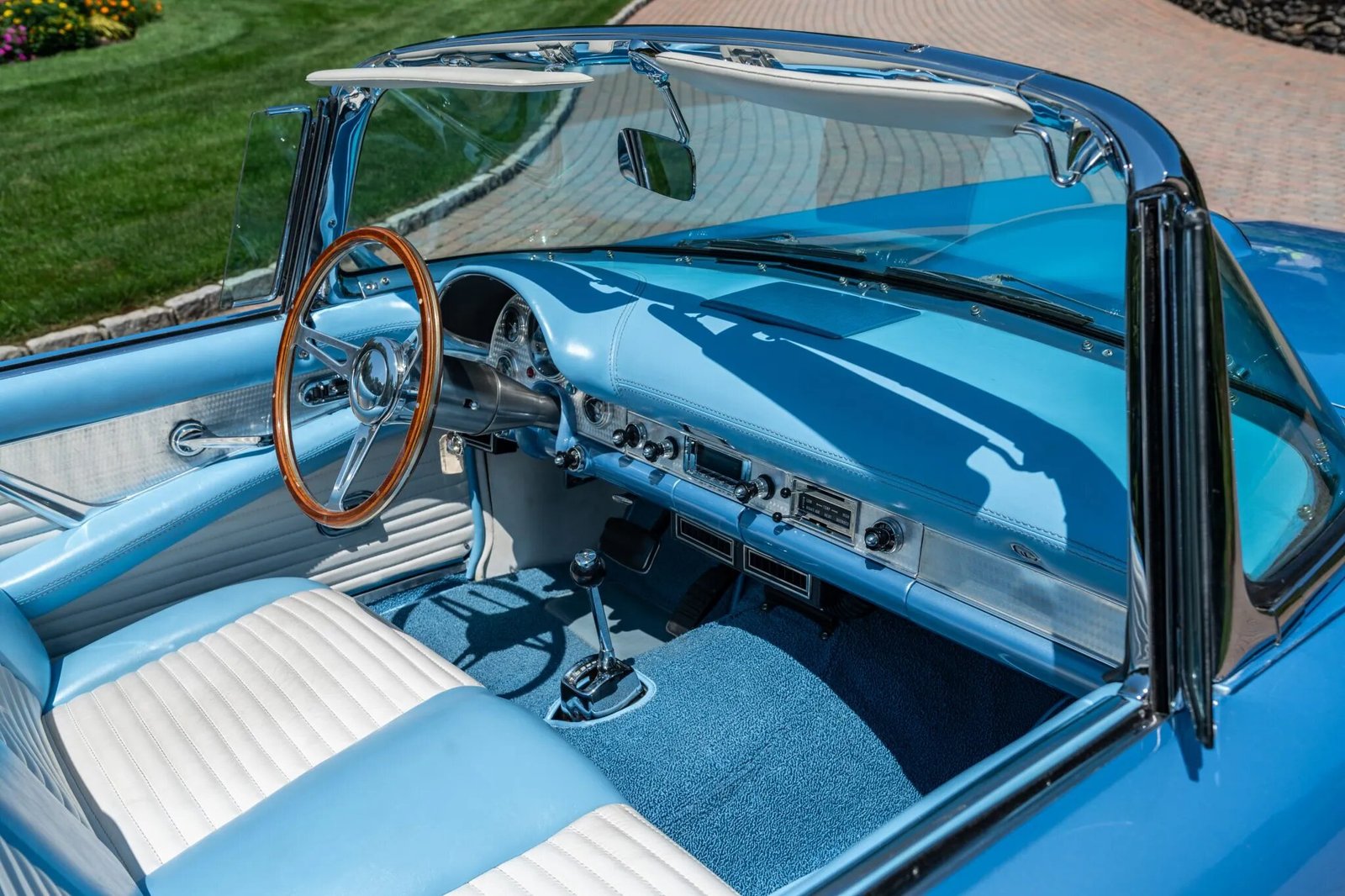 This 1957 Ford Thunderbird was modified in 2023 with a 5.0-liter Coyote V8, which is linked to a 4R70W four-speed automatic and a Strange Engineering 9″ rear end. Finished in metallic blue and white over a color-coordinated interior, the car rides on an Art Morrison chassis and also has a removable fiberglass hardtop, Truespoke stainless-steel-spoked wheels, a Wilwood master cylinder, a wood-rimmed steering wheel, power windows, a Retrosound stereo, and Classic Auto air conditioning.