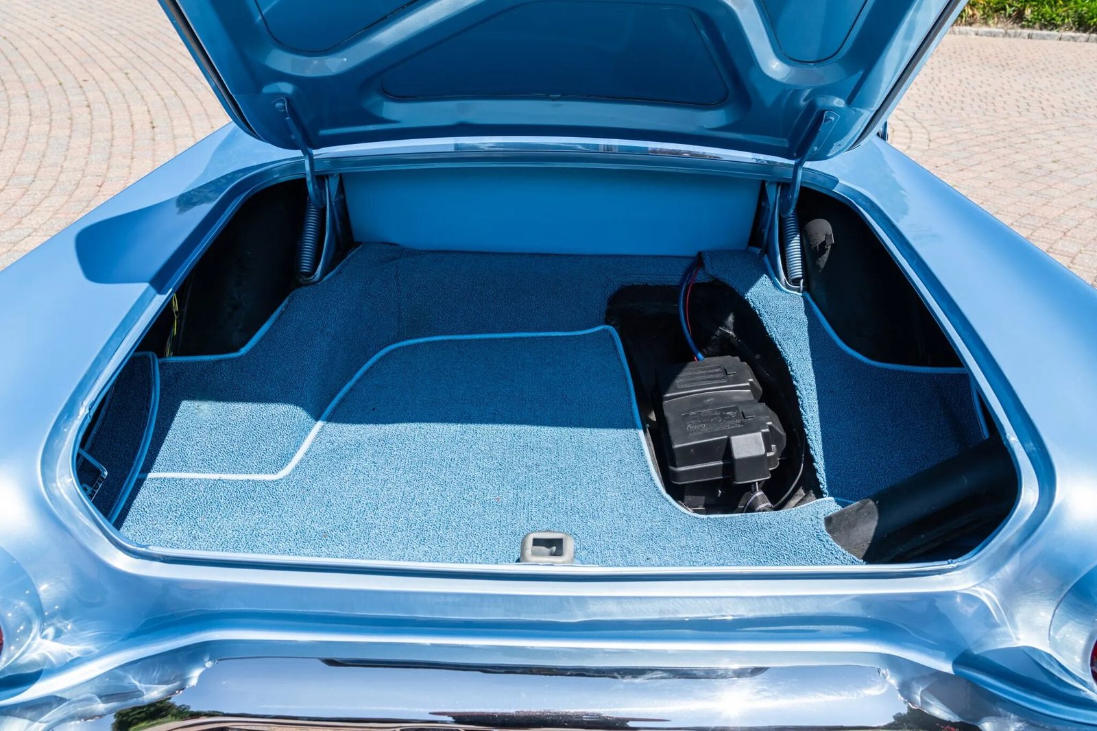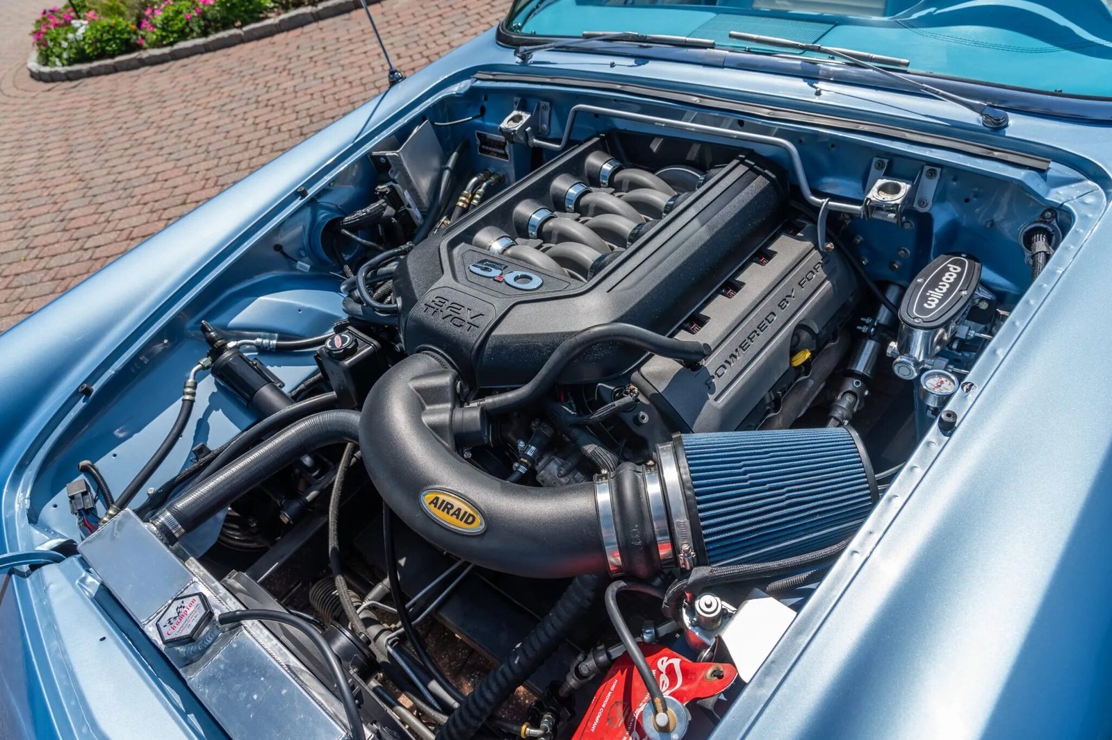 The battery has been relocated to the trunk. The 5.0-liter Coyote V8 have been a crate motor that was installed in 2023. It has an Airraid intake, an aluminum radiator, and a dual exhaust system with MagnaFlow mufflers. Power is routed to the rear wheels via a 4R70W four-speed automatic transmission and a Strange Engineering 9″ rear axle.