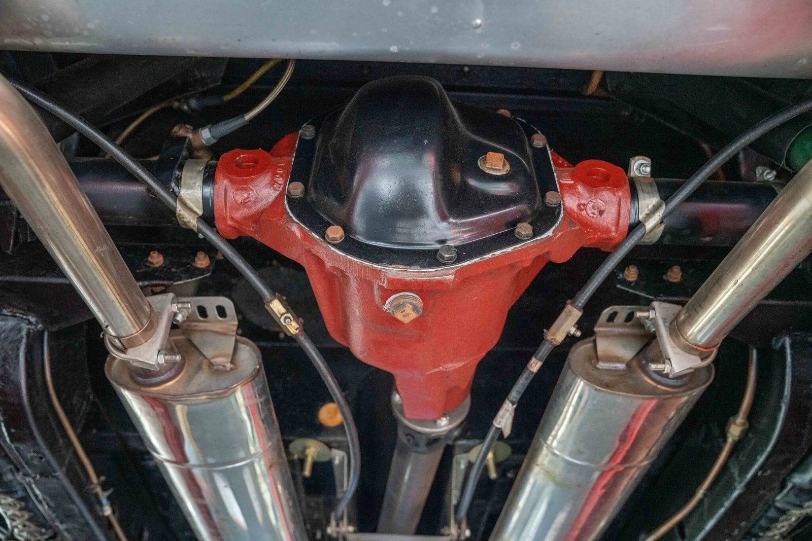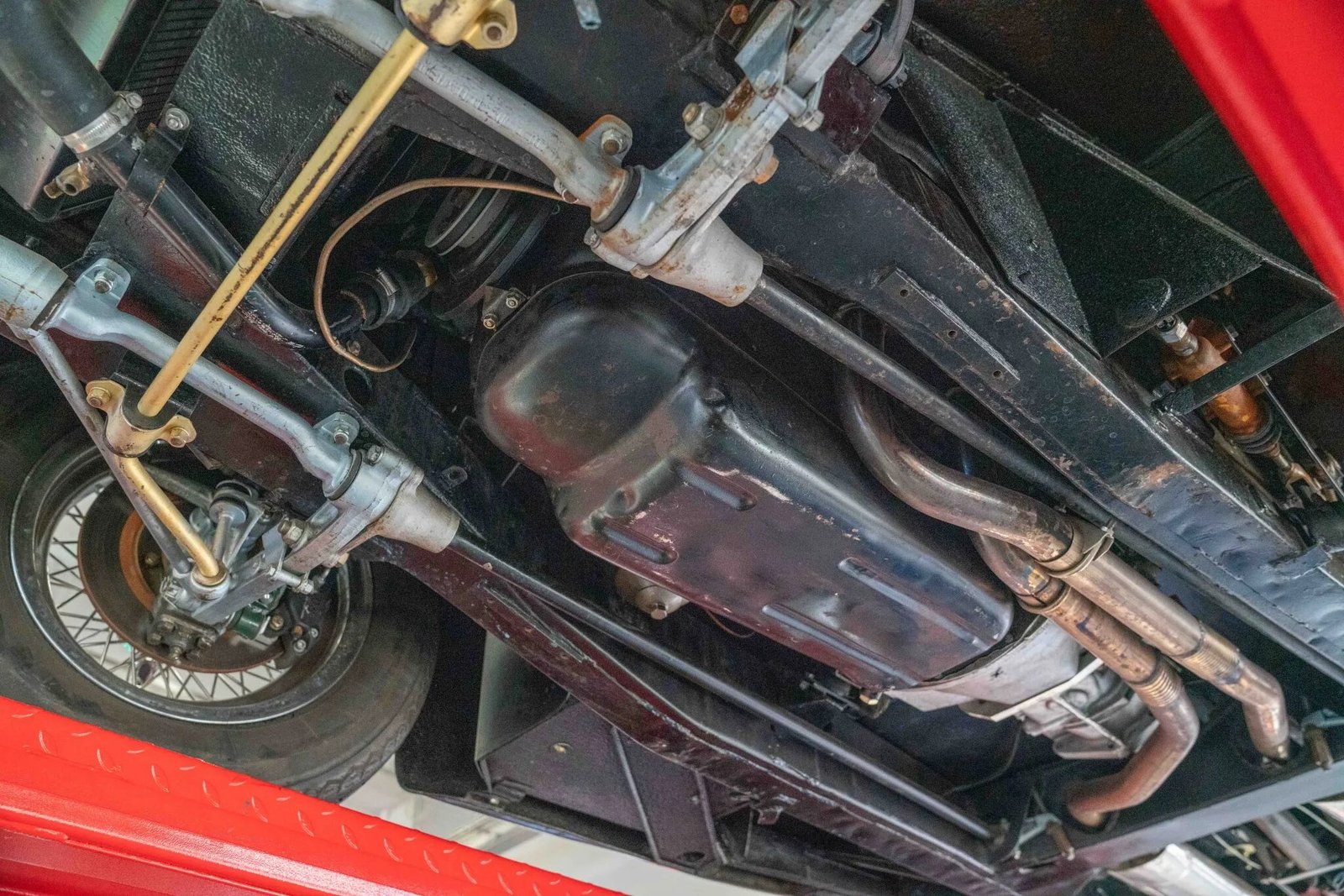 Chrome wire wheels are secured by knock-off spinners and mounted with Vredestein Sprint Classic tires. A matching spare is housed in the trunk. Wilwood front disc brakes were installed during the refurbishment, and the car rides on Spax Krypton shock absorbers.