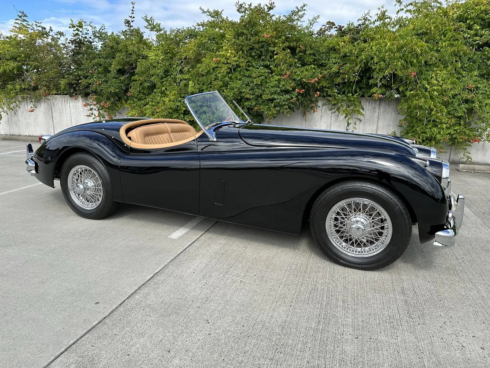 This 1957 Jaguar XK140 MC roadster was completed on January 23, 1957 and distributed in the US through Jaguar Cars of New York. It was refurbished between 2010 and 2013 by XK’s Unlimited , and work included a repaint in black, along with installing a five-speed manual transmission, Wilwood front disc brakes, and an aluminum radiator. Additional equipment includes a black soft top, dual SU carburetors, Lucas front driving lamps, and knock-off wire wheels.