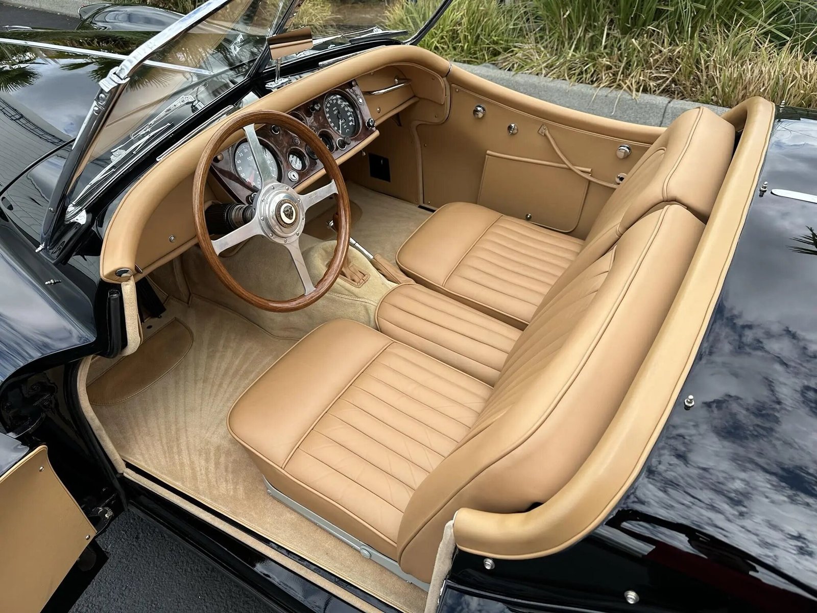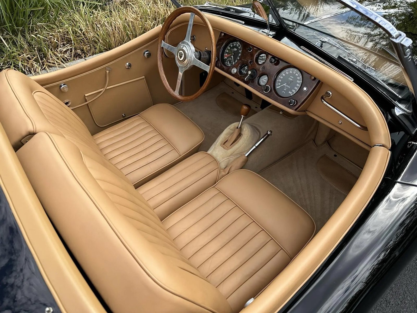 A wood-rimmed Moto-Lita steering wheel sits ahead of a central instrument panel housing Smiths instrumentation that was reportedly refurbished by West Valley Instrument Specialists.