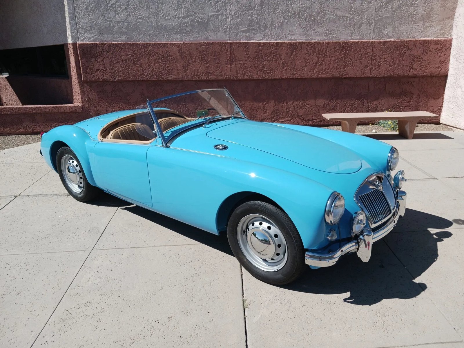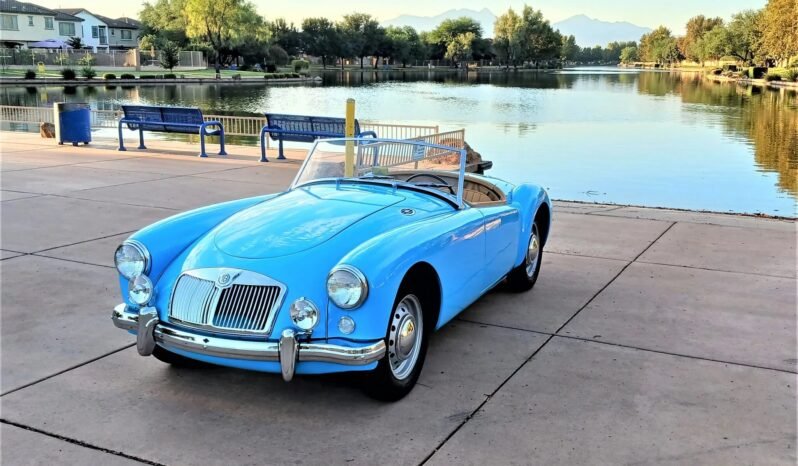 This 1957 MG MGA roadster was subsequently refurbished with work consisting of refinishing the body in blue, reupholstering the seats in tan leather, and performing upgrades to the 1,632cc inline-four. Additional equipment includes a four-speed manual transmission, a tan soft top, a heater, removable side curtains, 15″ steel wheels, Lucas driving lights, and chrome-finished bumpers with overriders.
