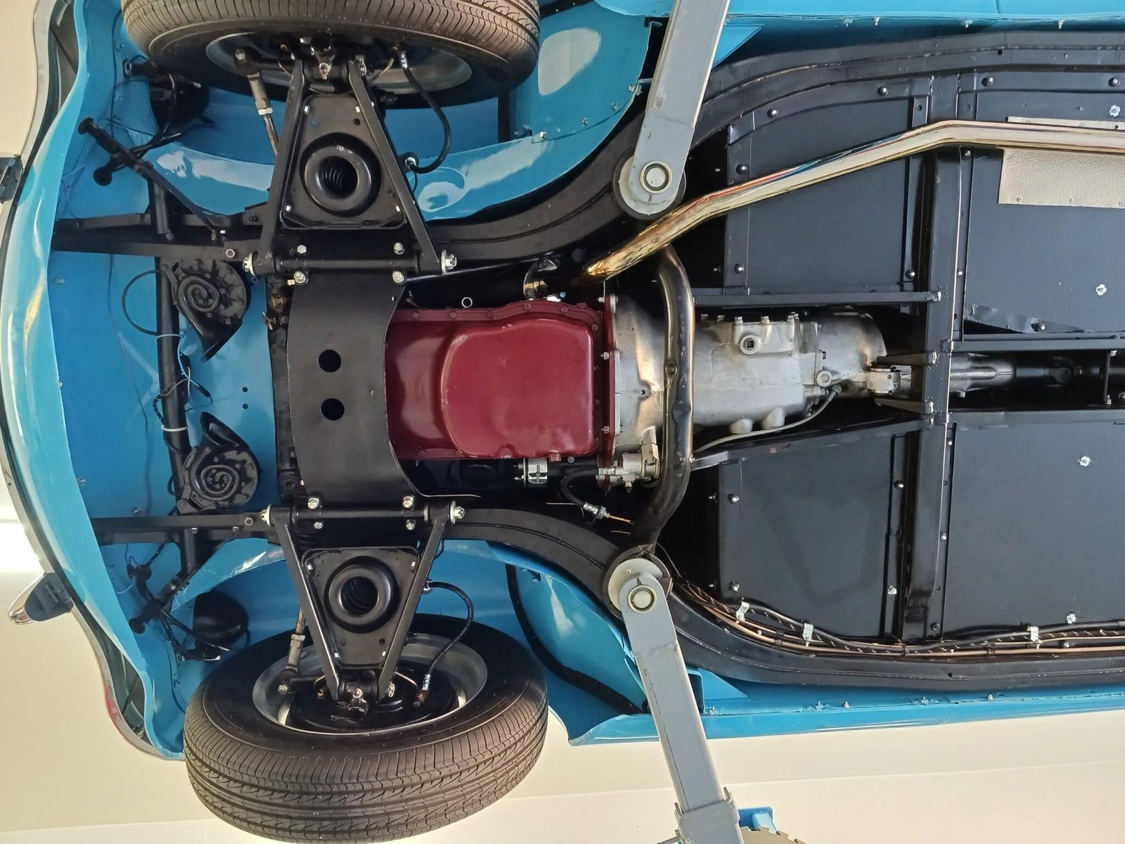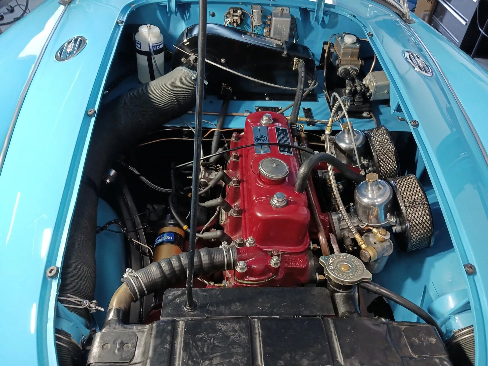 The 1,500cc inline-four was overbored to displace 1,632cc and features dual SU carburetors. Additional work included installing a PerTronix electronic ignition module and a spin-on oil filter, along with fitting bronze valve guides and Teflon valve stem seals onto the cylinder head and balancing the pistons and rods. The cylinder head was resurfaced, and service in preparation for the sale included an oil change and a valve adjustment.